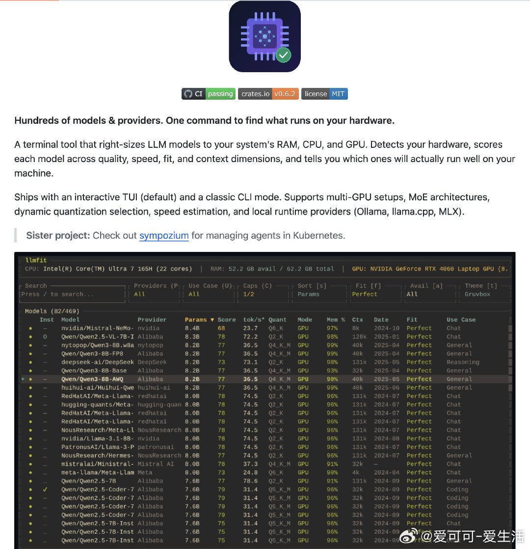 有个超实用的开源工具——llmfit(GitHub:github.com/AlexsJones/llmfit),能自动检测你电脑的CPU、内存和GPU配置,结合模型参数和量化信息,智能评估数百款主流模型(Meta Llama、Mistral、Qwen、DeepSeek、Llama.cpp等)在你本地硬件上的运行适配度、速度和质量,帮你快速找到最适合你机器的模型。