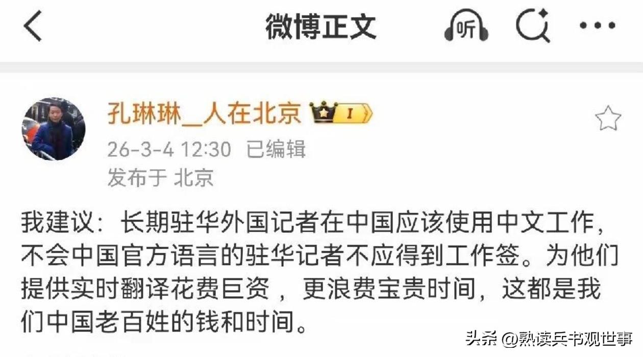 孔琳琳提议,驻华记者工作中应以中文优先,很好的提议,其实现在不光是记者,各行各业想跟中国深度打交道的,都在主动学中文。 这个提议,别说现在,就算以前推行起来也很容易,比如规定驻华记者必须通过高等级的中文考试,取消同声传译,直接发中文通稿。这样一来,既省事,也逼着他们真正去理解中国。 那问题来了:既然这样,为啥我们过去一直花大价钱、费大力气,给外国记者“喂细粮”?我们当然不是冤大头,核心原因是,中文的精妙之处,尤其是外交辞令,必须得精通两种语言和文化的人,才能翻得准。 这是必须承担的,高级语言在翻译中,它就是吃亏的。 举例,英文原句: "I love three things in this world: the sun, the moon, and you." 机器:“我爱这个世界上的三样东西:太阳、月亮,和你。” 信达雅翻译:“浮世万千,吾爱有三:日月与卿。” 这差距,就像菠萝和菠萝蜜,根本不是一个味。 我们外交上的用词字斟句酌,一句话背后可能站着好几层态度。为了保证信息出去的时候不变形、不被曲解,前期多花点精力、多投点资源去精准翻译,是必须的。这钱省不了。 反过来看,像美国那边,发言人说话经常云山雾罩,今天说了明天可能就不认账。白宫工作倒是省事了,反正不用对每个词负责,糊弄过去就行。但我们显然不能这么干。 所以,前期为了准确性和权威性,这个成本得认。不过随着AI越来越强,语料库越来越全,很多翻译难题以后是可以慢慢交给技术去解决的。到那时候,实现“中文优先”就会更顺畅,也更省力。 方向是对的,走着看就行。