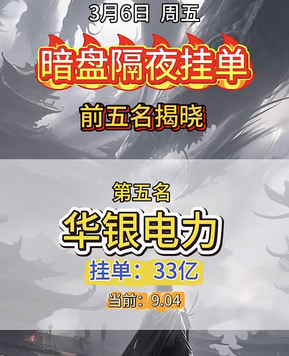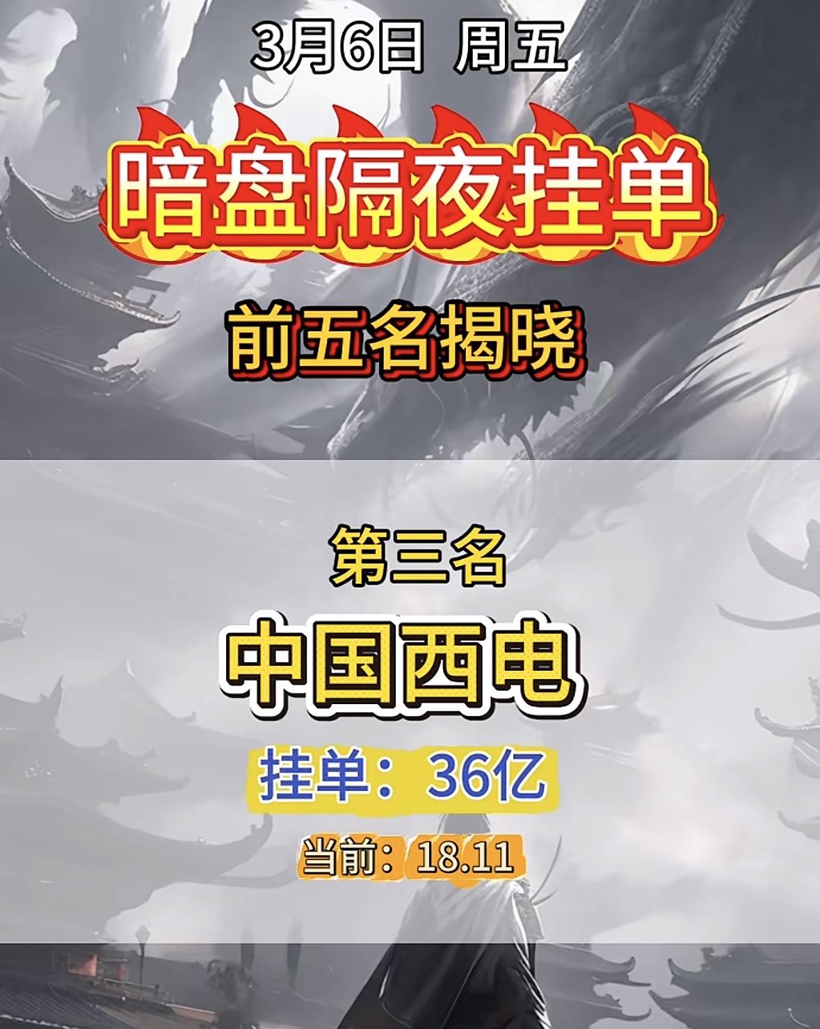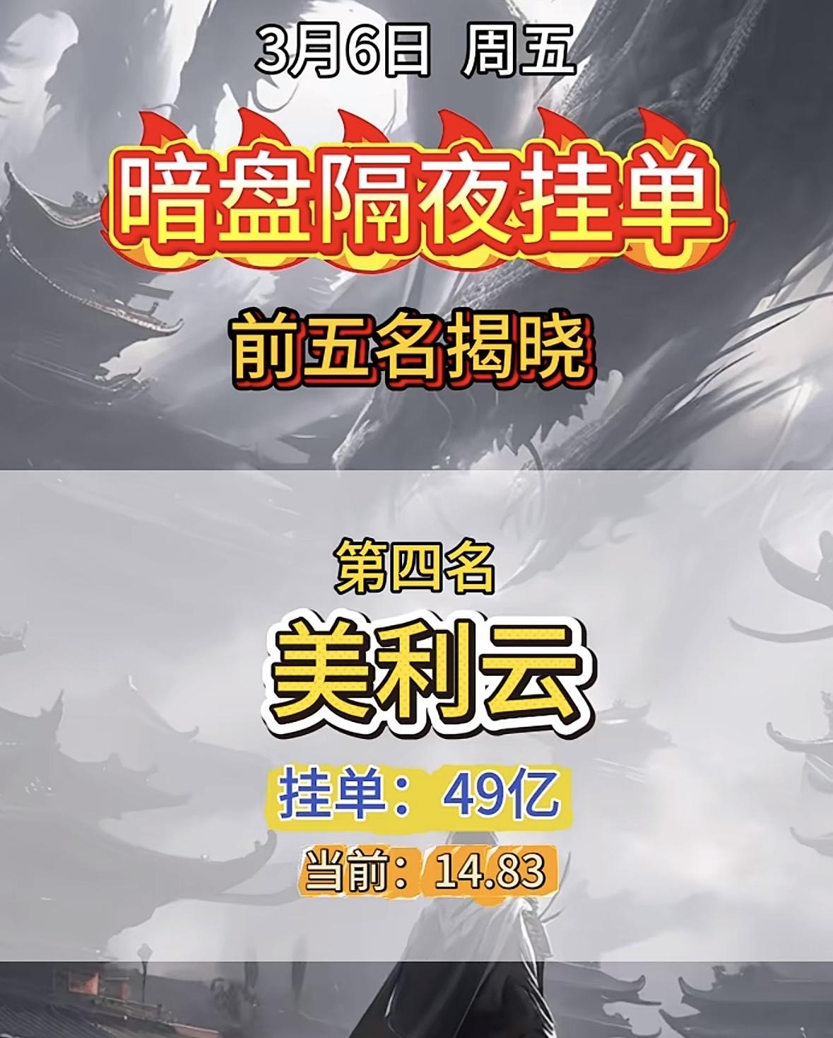 3月6日周五晚上暗盘隔夜挂单前5名个股榜出炉! 暗盘隔夜挂单,前五名揭晓!美利云强势上榜!汉缆股份暗盘挂单夺冠,隔夜交易势头强劲,市场关注度