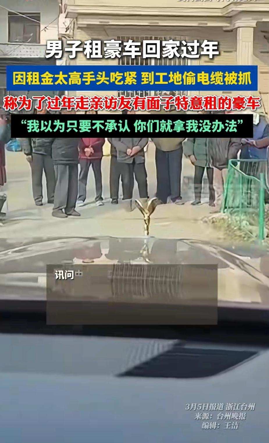 男子租豪车回家过年,因租金太高手头吃紧,竟大胆到工地偷电缆。被抓后称:之所以租豪车是为了过年走亲访友有面子。 我以为只要不承认他们就没办法!本想死不认账,没想到证据摆在眼前,只能进去好好改造了。 浙江台州这陈某,为了过年走亲访友有面子,租豪车撑场面。结果租金太高,手头吃紧,信用卡刷爆、网贷还不上,竟动了歪心思。2月23日凌晨,他开着无牌照旧车到工地偷电缆。偷完回家睡俩小时,凌晨4点又开车去温岭废品站销赃。 这男子真是打肿脸充胖子,死要面子活受罪子活受罪。为了所谓的面子,网络贷款花大价钱租豪车,回乡过年走亲访友满足自己的虚荣心理。 最终因还不上网贷,还刷爆了信用卡,被逼无奈动了贼心去做贼。为了满足自己的虚荣心,把自己整进去太不值得了。 民警通过车辆轨迹锁定他,他一开始还死不承认。后来民警从销赃渠道找到证据,他才交代盗窃经过。现在他已被依法采取强制措施。为了面子租豪车,最后去偷电缆,这面子要得太不值,真是糊涂啊!