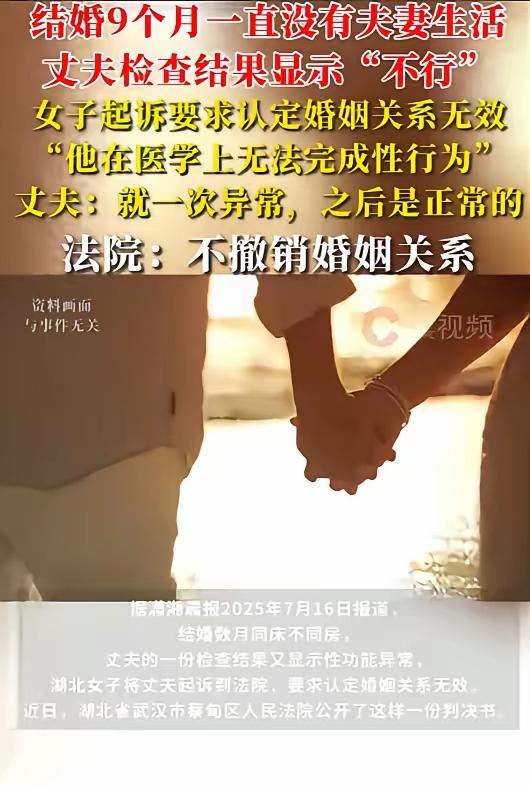 湖北武汉相亲奇案:新婚九月丈夫竟“医学上无能”,妻子含泪提离婚反遭驳“就一次不行”,法院判决引爆全网争议! 婚床冰冷九个月,妻子忍尽委屈却等来一纸医学判决——丈夫身体根本“无法完成性行为”。当她鼓起勇气走向法院,对方竟轻飘飘辩解“只是偶然失常”。这场始于相亲的婚姻,究竟藏着多少难以启齿的谎言? 女子满怀憧憬走入婚姻,以为寻得余生依靠。谁知新婚夜起便是无休止的回避疏离,她一度自责是否做得不够好。直到长辈催生压力袭来,她才不得不直面这段婚姻里最刺骨的真相:同床异梦,竟成日常。 九个月时间里,她试过温柔沟通,也试过默默等待,甚至为男方面子忍下所有流言。可换来的却是对方一次次以“累”“压力大”搪塞。那份孤独,如同生活在同一屋檐下的陌生人,连争吵都成了奢侈。 最终医院报告击碎所有幻想。白纸黑字写明男方存在医学上的功能性障碍,且难以逆转。妻子这才恍然,原来婚前知情不告,才是这场婚姻悲剧的根源。她所期待的相濡以沫,从一开始就是场精心设计的骗局。 法庭之上,男方仍坚持“仅一次异常”,试图用苍白辩解掩盖长期欺骗。但九个月零亲密的事实,连同权威医学证明,早已揭穿所有虚伪。婚姻基石应是坦诚,而非利用对方善意编织沉默牢笼。 法院审理后认定,婚前隐瞒重大生理缺陷已违背婚姻诚信原则。虽然最终判决准予离婚,维护了女方权益,但过程里暴露的相亲婚恋隐患,仍令人深思。多少人在家庭社会压力下,匆忙选择将就,反而埋下更大苦果? 这起案件迅速引爆网络,正因它戳中无数人心中隐痛:婚姻是否只剩形式?当健康、性、情感交流皆可被隐瞒,婚姻的神圣性何在?评论区瞬间涌满网友愤慨——“这不是结婚,这是诈骗!”“支持女方,九年青春谁赔?” 透过现象看本质,此事不仅关乎一桩婚姻判决。它折射出当代婚恋市场中,急于求成而忽视深度了解的普遍困境。法律虽能判离,却抚不平被欺骗的情感创伤。唯有婚前清醒审视,婚后勇敢止损,方能避免人生沦为他人谎言的牺牲品。 相亲风险 婚姻诚信 女性权益 (来源:根据湖北省武汉市蔡甸区人民法院公开判决书及晨报相关报道撰写)