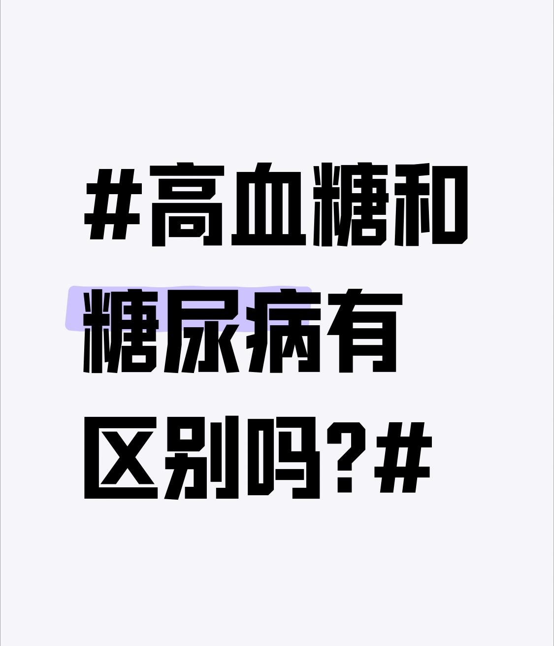 高血糖和糖尿病可不能划等号!高血糖是身体在某时间点,血液中葡萄糖含量超正常范围,它是一种状态,像饱餐、情绪紧张、急性感染或服药后都可能引发,等这些因素消失,血糖能恢复正常。 而糖尿病是因胰岛素分泌不足或作用障碍导致的慢性代谢疾病,是身体调节血糖系统出了长期甚至永久性“故障”,得长期管理治疗。从诊断标准看,单次空腹血糖超正常就算高血糖,而空腹血糖≥7.0mmol/L、餐后2小时或随机血糖≥11.1mmol/L,合并症状且排除其他疾病,才能诊断糖尿病。所以发现血糖高别慌,及时复查,找医生明确原因。