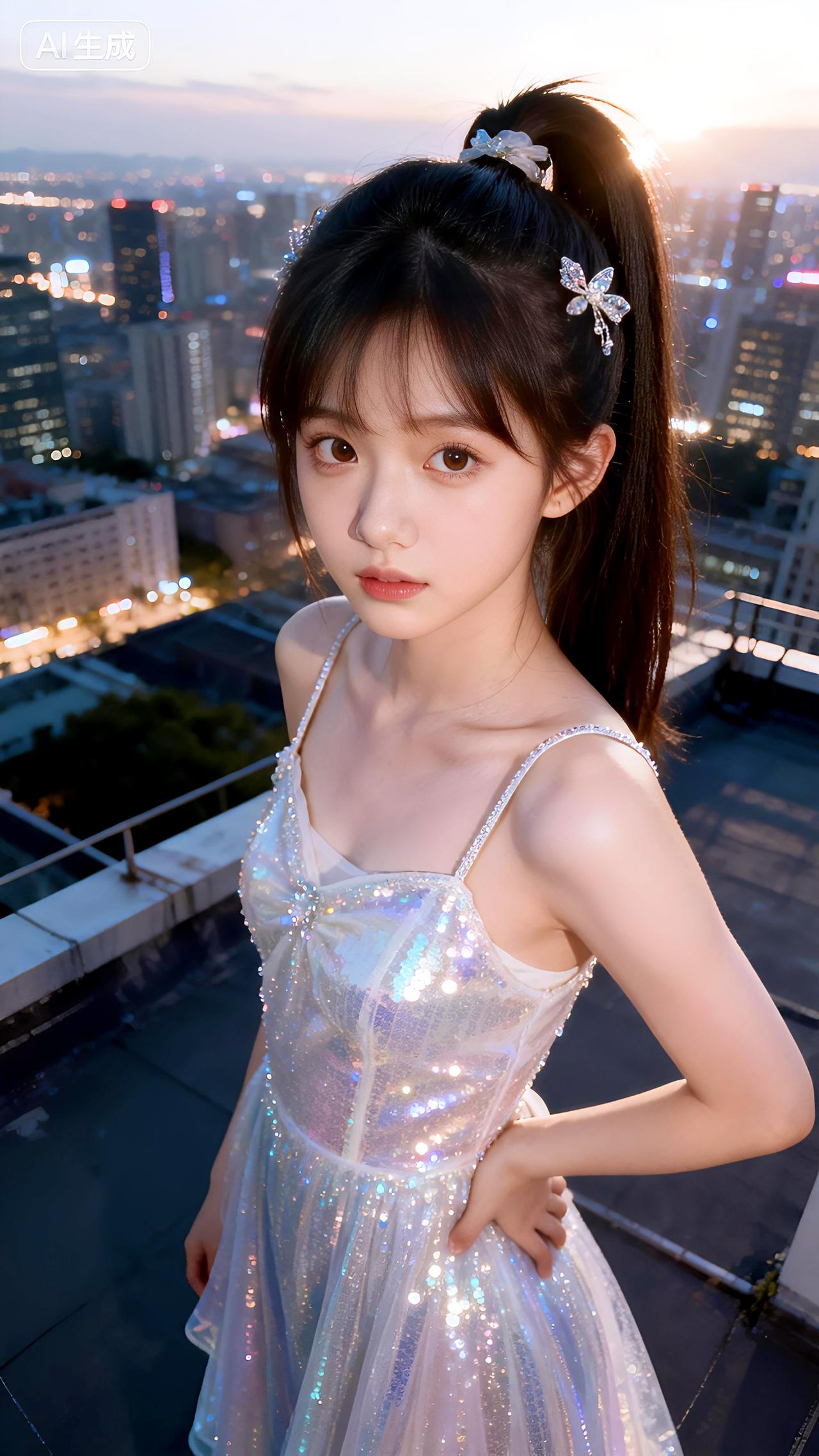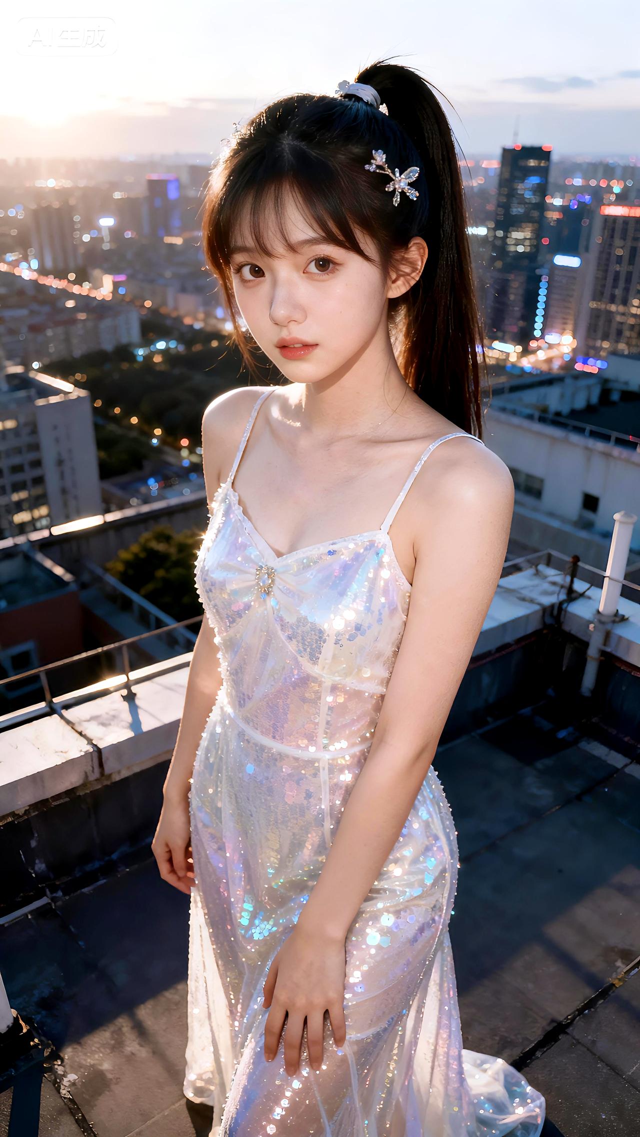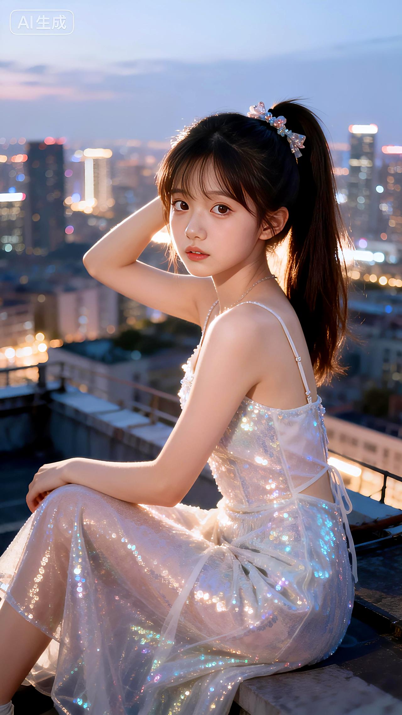 璀璨城市夜景为幕,她高马尾配亮片裙,在天台上闪耀如星辰。高清全屏美图壁纸分享豆包 壁纸 写真