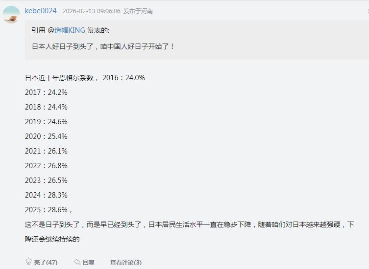 发达国家之耻,日本变态的恩格尔系数:日本人好日子到头了,咱中国人好日子开始了! 日本近十年恩格尔系数, 2016:24.0% 2017:24.2% 2018:24.4% 2019:24.6% 2020:25.4% 2021:26.1% 2022:26.8% 2023:26.5% 2024:28.3% 2025:28.6%, 这不是日子到头了,而是早已经到头了,日本居民生活水平一直在稳步下降,随着咱们对日本越来越强硬,下降还会继续持续的!