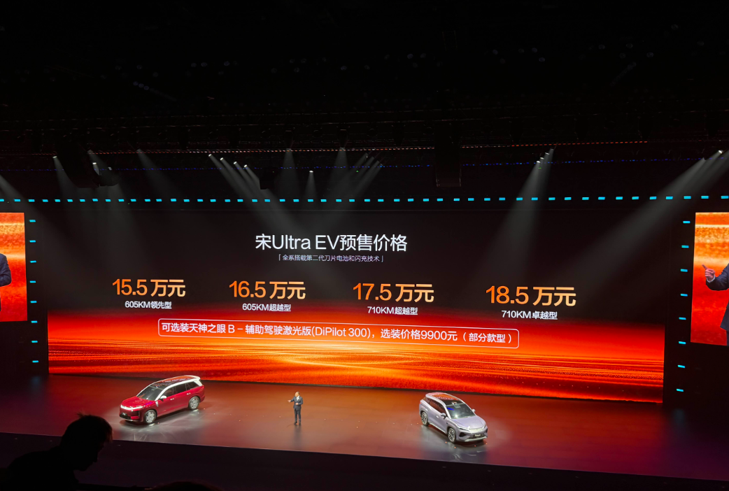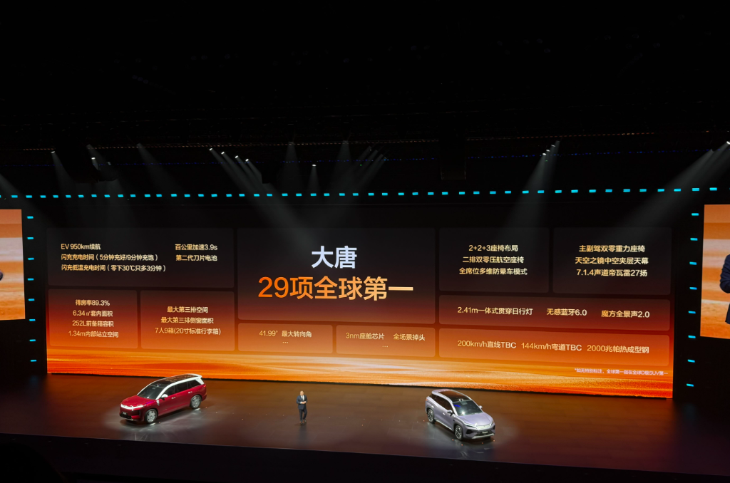 亚迪闪充发布会王朝网环节 大唐量产车首次公众亮相 纯电版续航里程950km、四驱版百公里加速3.9s、2+2+3座椅布局 宋Ultra EV是开启预售[思考]预售价15.5-18.5万元,共4个配置,将在3月底正式上市
