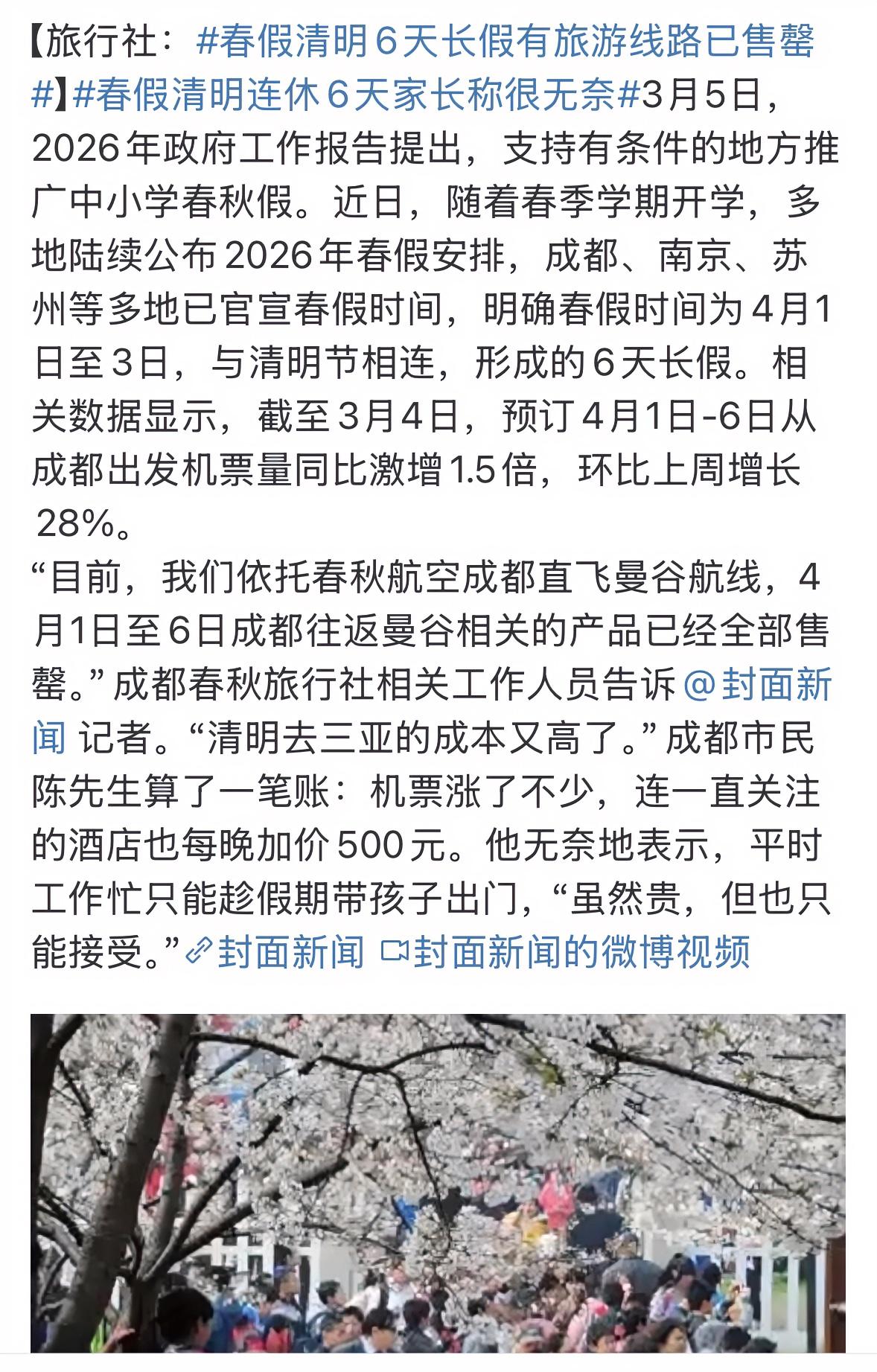 中小学春假清明连休6天家长称很无奈,今年起大部分中小学开始实行春秋假模式。 今年中小学春假和清明节连在一起可休息6天,不过家长反映孩子放假家长不放假依旧没有时间带孩子出去,加上假期酒店涨价家长表示很无奈。 网友评论孩子放假家长不放假只会增加家长负担,不过可以建议有孩子的家长也可以和孩子共享春假,解决孩子放假没人看问题。中小学春假连休6天
