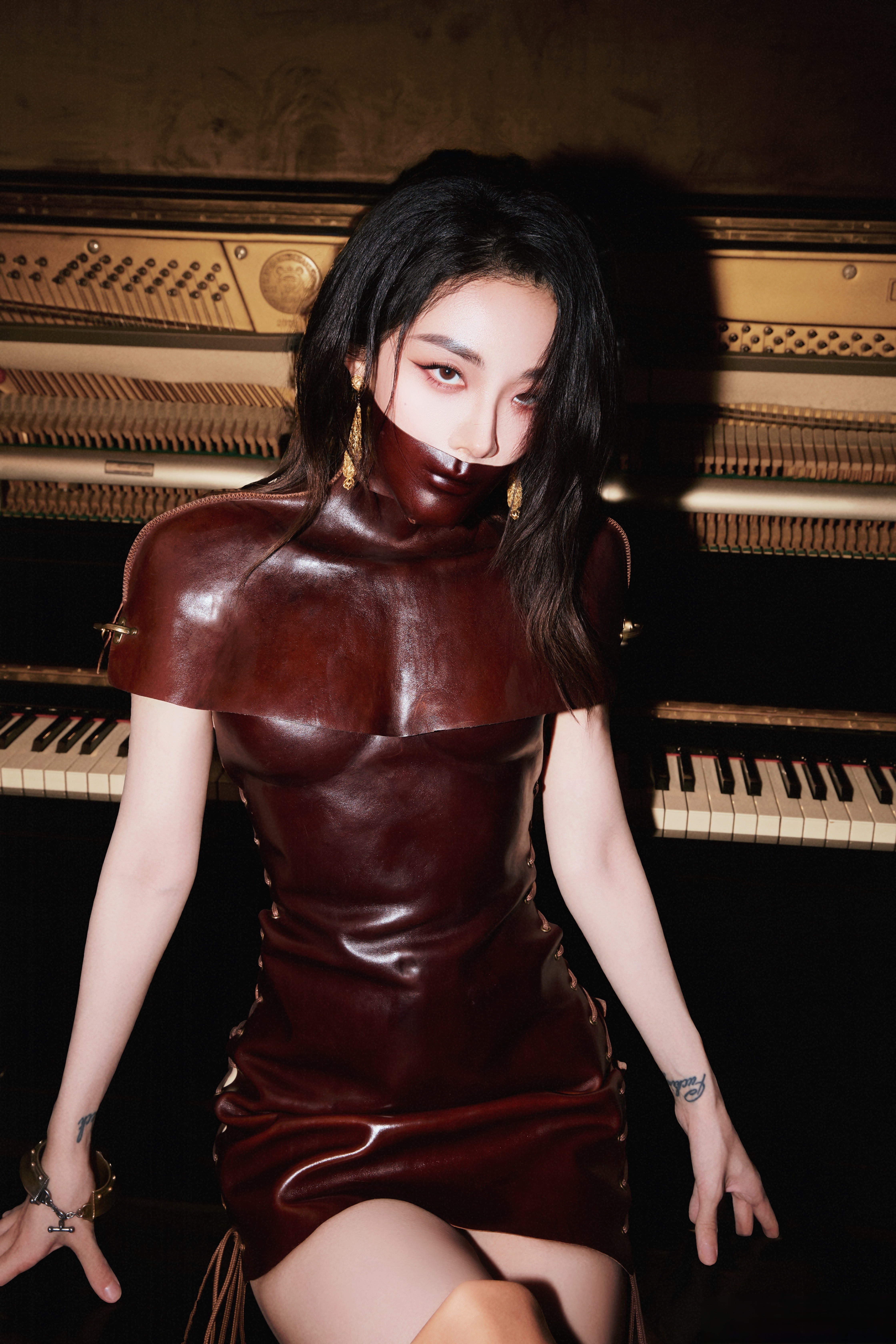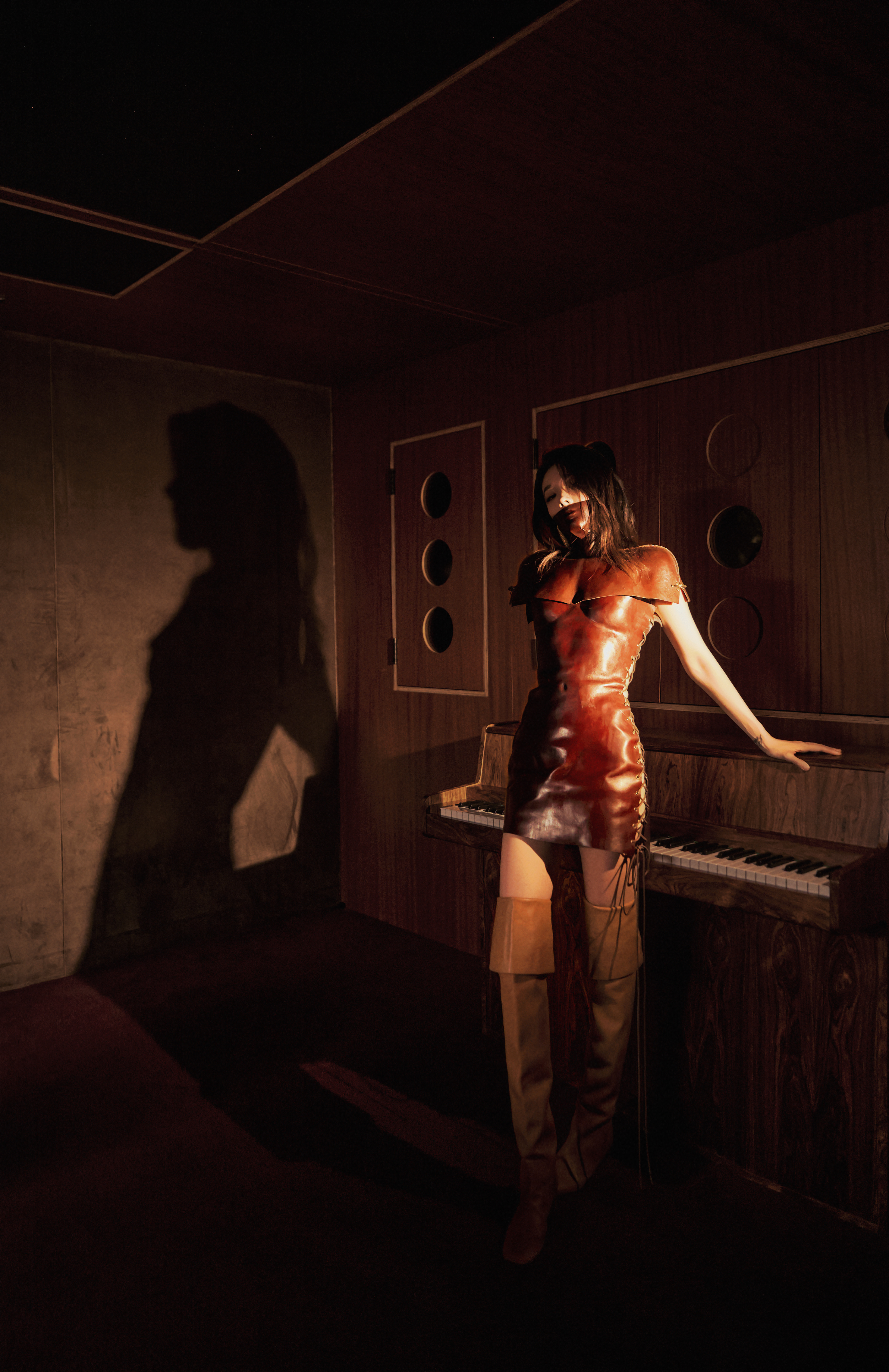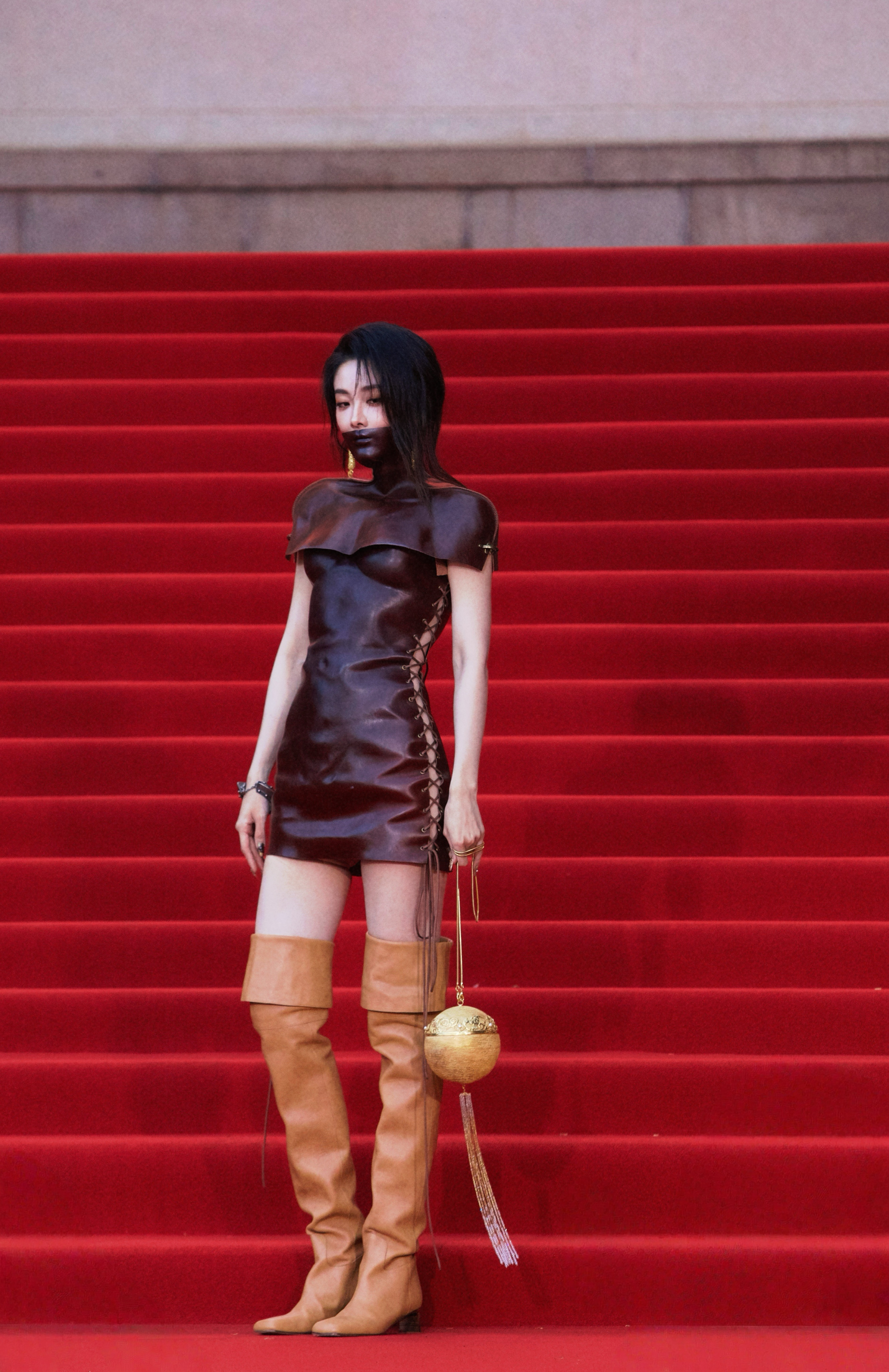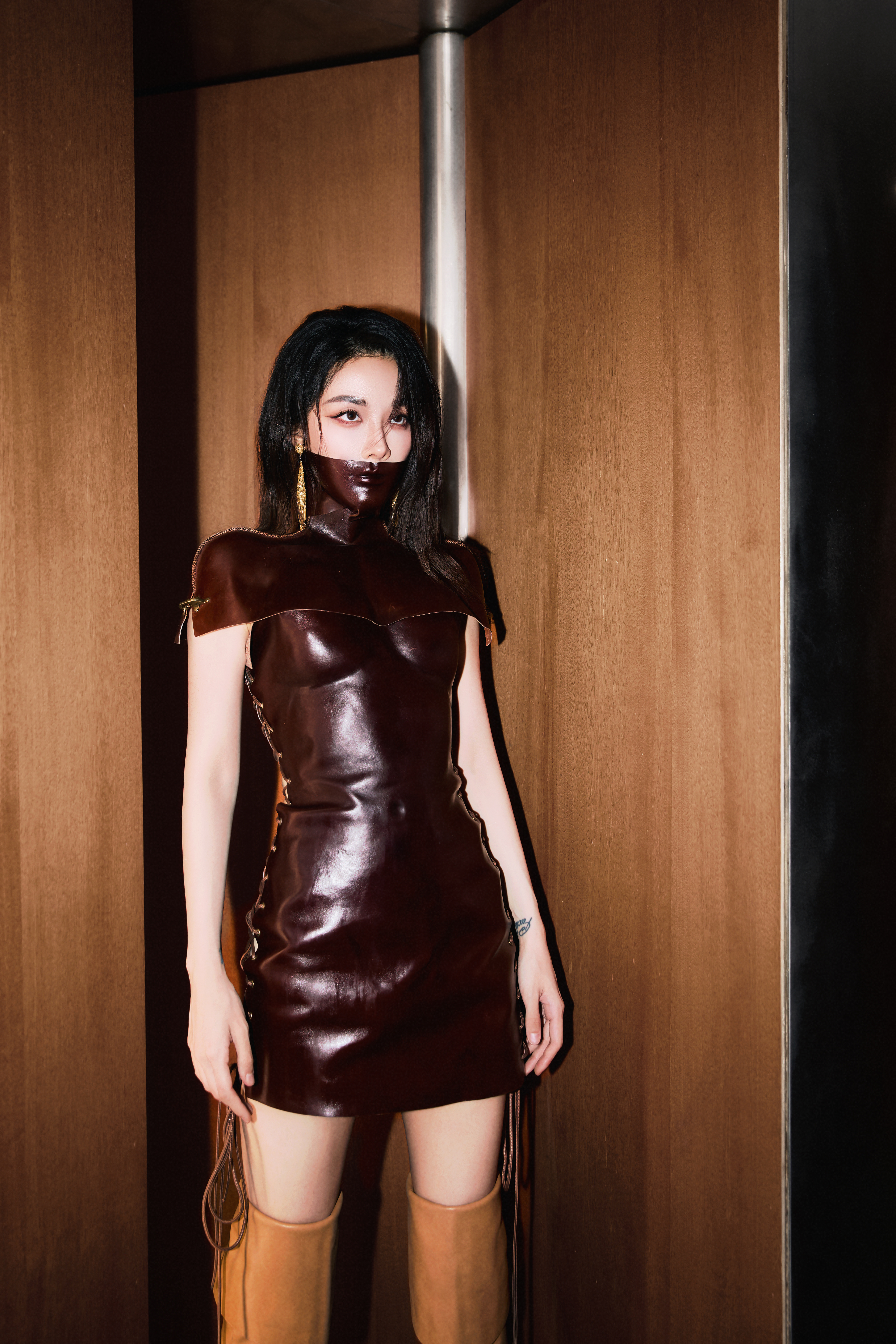 喻言喻言暗红皮质紧身包臀裙棕色过膝长靴