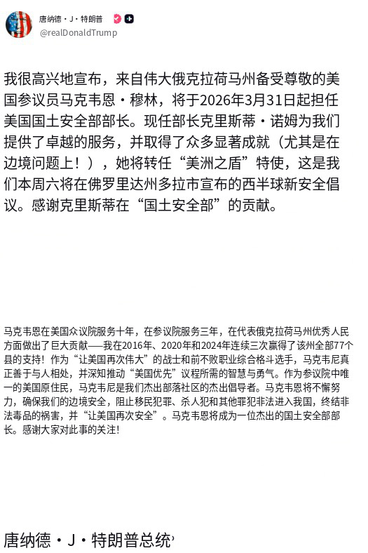 🔻特朗普宣布:“我很高兴宣布,来自俄克拉荷马州备受尊敬的美国参议员马克韦恩·穆林将于 2026 年 3 月 31 日起出任美国国土安全部部长。”🔻诺姆下课了,去任什么“美洲之盾”了。🔻via realdonaldtrump 海外新鲜事 热点现场