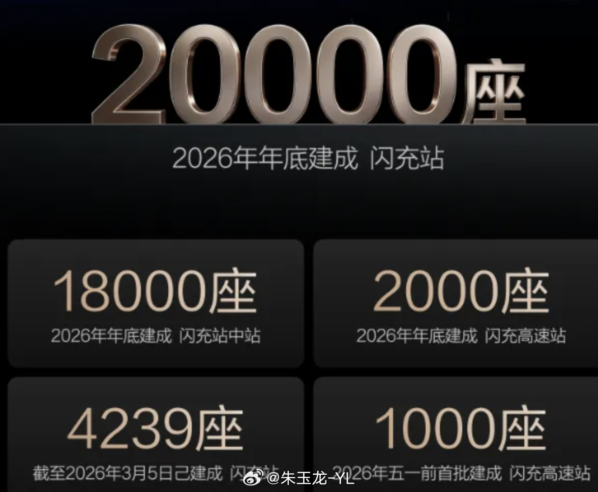 常温性能:10%-70% 仅 5 分钟,10%-97% 仅 9 分钟(全球量产最快),当然最核心的是启动闪充中国战略,2026 年底建2 万座闪充站(1.8 万城市站 + 2000 高速站)。