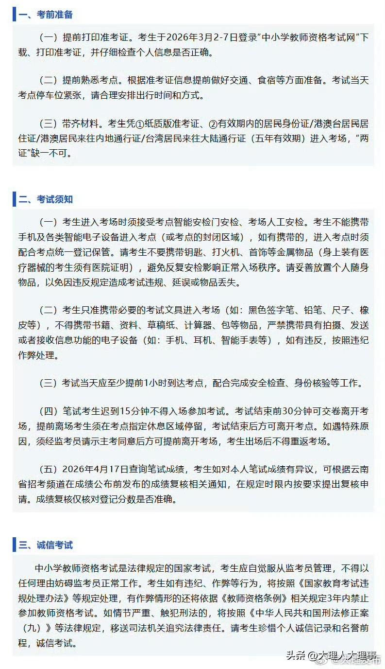 云南2026年上半年中小学教师资格考试笔试3月7日就要开考啦!3月2 - 7日要登录“中小学教师资格考试网”打印准考证,还得仔细核对信息。 考试当天,得凭准考证和有效身份证件入场,“两证”缺一不可。进考场要过智能安检门和人工安检,手机等智能设备不能带,金属物品也尽量别带,不然反复安检影响入场。只准带必要文具,像黑笔、铅笔啥的。 建议提前熟悉考点,合理安排交通和食宿,当天至少提前1小时到考点。迟到15分钟就不能进考场了,4月17日能查成绩,对成绩有异议还能申请复核。考生们加油冲! 教师考试证 教师资格必刷题 云南教招面试 云南 教师资格证