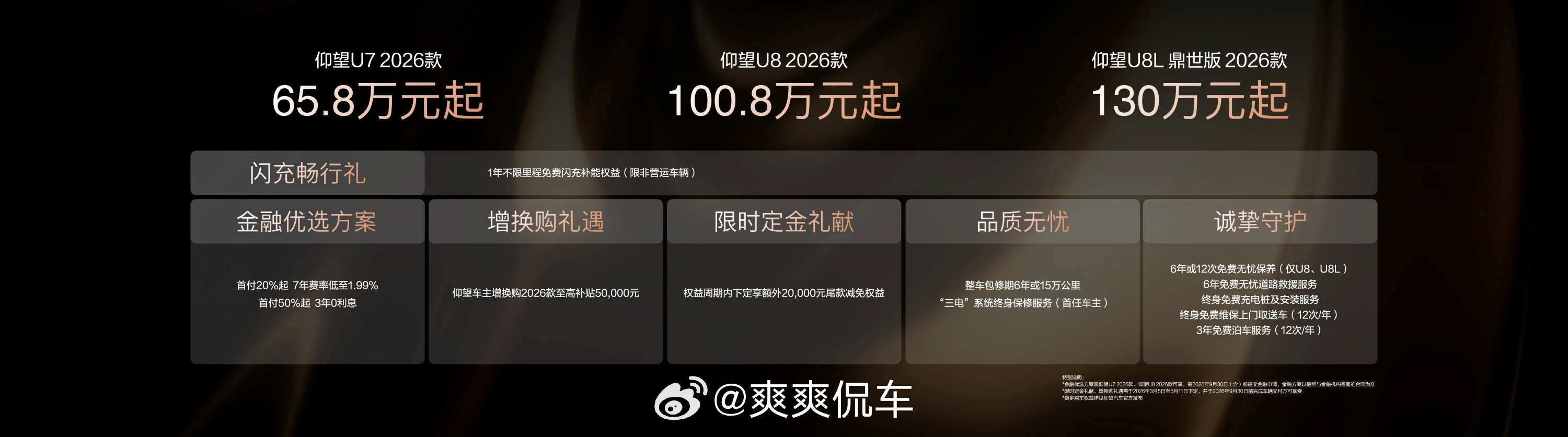 3 月 5 日比亚迪发布 2026 款仰望 U7、U8、U8L 鼎世版,起售价分别 65.8 万、100.8 万、130 万。新车搭第二代刀片电池和仰望加闪充,续航、充电、操控全升级,还有超多购车权益,U8L 更是成了不少企业家的选择,老车主还能 OTA 升级安全功能。新款仰望U7新款仰望u8上市总裁严选座驾仰望U8L仰望U8L鼎世版2026款