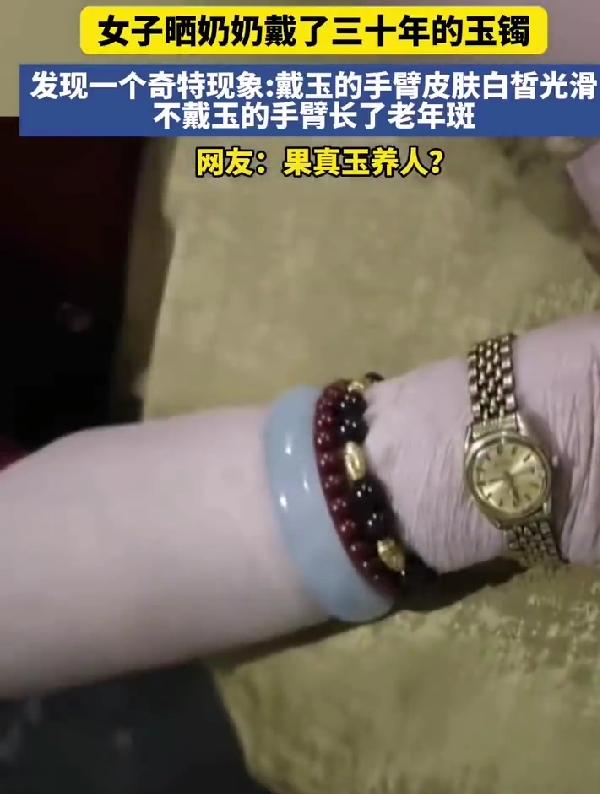 女子晒奶奶戴30年玉镯,戴玉的手臂光滑无斑,玉养人果然不假 最近刷到一个特别神奇的事儿,有个女子晒出奶奶戴了三十年的玉镯,意外发现一个奇特现象,看完真的被惊艳到了。 奶奶戴玉镯的那只手臂,皮肤光滑细腻,一点老年斑都没有,反观没戴玉镯的另一只,却长满了明显的老年斑,反差特别大。 女子说,这只玉镯奶奶戴了整整三十年,从来没摘下来过,不管是做家务、干农活,还是日常起居,一直贴身戴着。 一开始大家都没在意,直到最近女子给奶奶拍照片,才发现两只手臂的皮肤状态差距这么大,越看越觉得神奇。 照片里能清晰看到,戴玉镯的手臂肤色均匀,摸起来滑溜溜的,而没戴的那只,布满了深浅不一的老年斑,很是明显。 女子把这个发现分享到网上,瞬间引发热议,很多网友都说,没想到玉真的能养人,这就是最真实的例子,太直观了。 也有网友分享自家老人的经历,说家里长辈戴玉多年,皮肤确实比同龄人好,看来老辈人说的“玉养人”不是迷信。 奶奶自己也说,戴了这么多年玉镯,没觉得有什么特别,就是习惯了,没想到还能让手臂皮肤保持这么好的状态。 有人好奇,玉到底是怎么养人的?其实老辈人一直说,玉能滋养肌肤、安神静心,长期佩戴,能和人体形成良性互动。 也有懂行的人说,玉里面含有多种微量元素,长期贴身佩戴,这些元素会慢慢渗透到皮肤里,滋养肌肤、改善肤质。 还有人调侃,这只玉镯戴了三十年,不仅没磨损,反而越戴越温润,看来玉和人一样,也能互相滋养、彼此成就。 女子说,奶奶特别珍惜这只玉镯,就算不小心磕碰,也会小心翼翼擦拭干净,这么多年一直好好爱护,从未丢弃。 很多网友看了都羡慕不已,说既羡慕奶奶有这么一只养人的玉镯,更羡慕她几十年如一日的偏爱,这份坚守也很动人。 其实不管玉养人是科学原理,还是心理作用,奶奶戴了三十年玉镯,手臂皮肤确实比同龄人好,这是实实在在的事实。 老一辈传下来的说法,往往藏着古人的智慧,玉不仅是一种饰品,更是一种陪伴,一种对生活的美好期许。 看着奶奶戴了三十年的玉镯,还有那只光滑无斑的手臂,终于明白,为什么大家一直说玉养人,果然名不虚传。