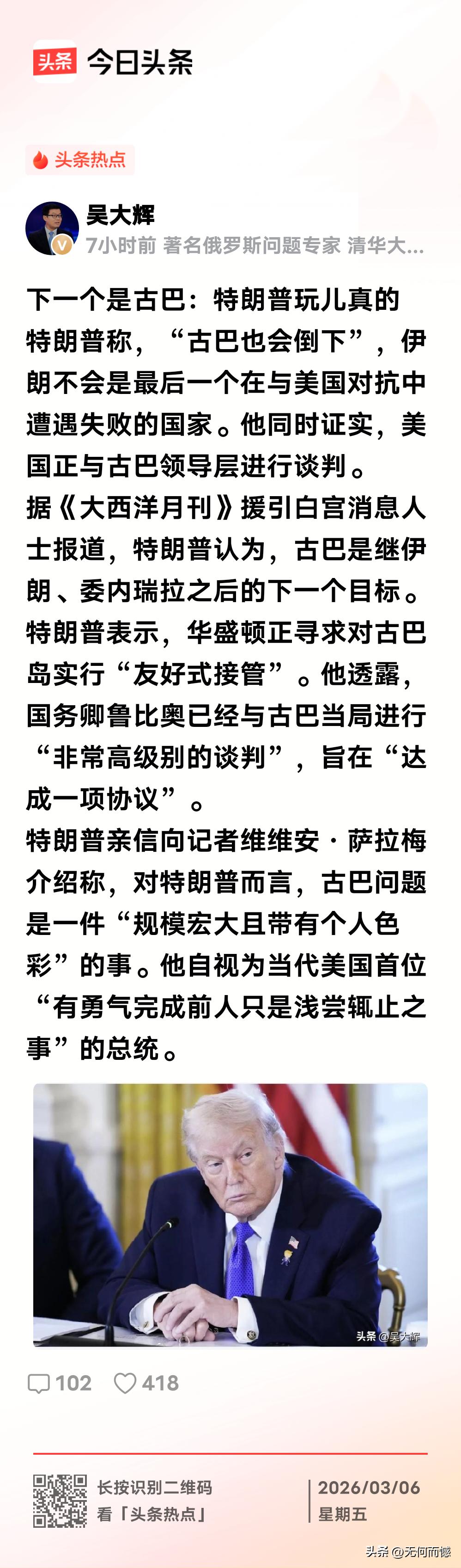 老特真是够疯狂的了,在对伊朗的打击还没有取得预期效果的情况下,现在又惦记上古巴了,这胃口真是够大的了,感觉他的路线图就是先拿下委内瑞拉,接着再拿下伊朗,然后再解决古巴,可这仅仅是一厢情愿的想法,现在伊朗就够他喝一壶的了,他能否全身而退,都是一个未知数!
