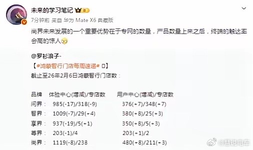 孙少军搞不好都要失业。。。唉,现在新势力车企没有周销量的数据,又看不到销售大定的数据,哪里还有热度呢?鸿蒙智行昨天费了老大力气开完了发布会,昨晚能看到啥反馈么?几乎没有。讨论都找不到聚焦点。要过去就简单,都盯着大定的数据,这就是最好的讨论焦点。现在看享界的专店数量还是太少,S9和S9T能有现在的销量,产品力确实不差。孙少军汽车销量鸿蒙智行