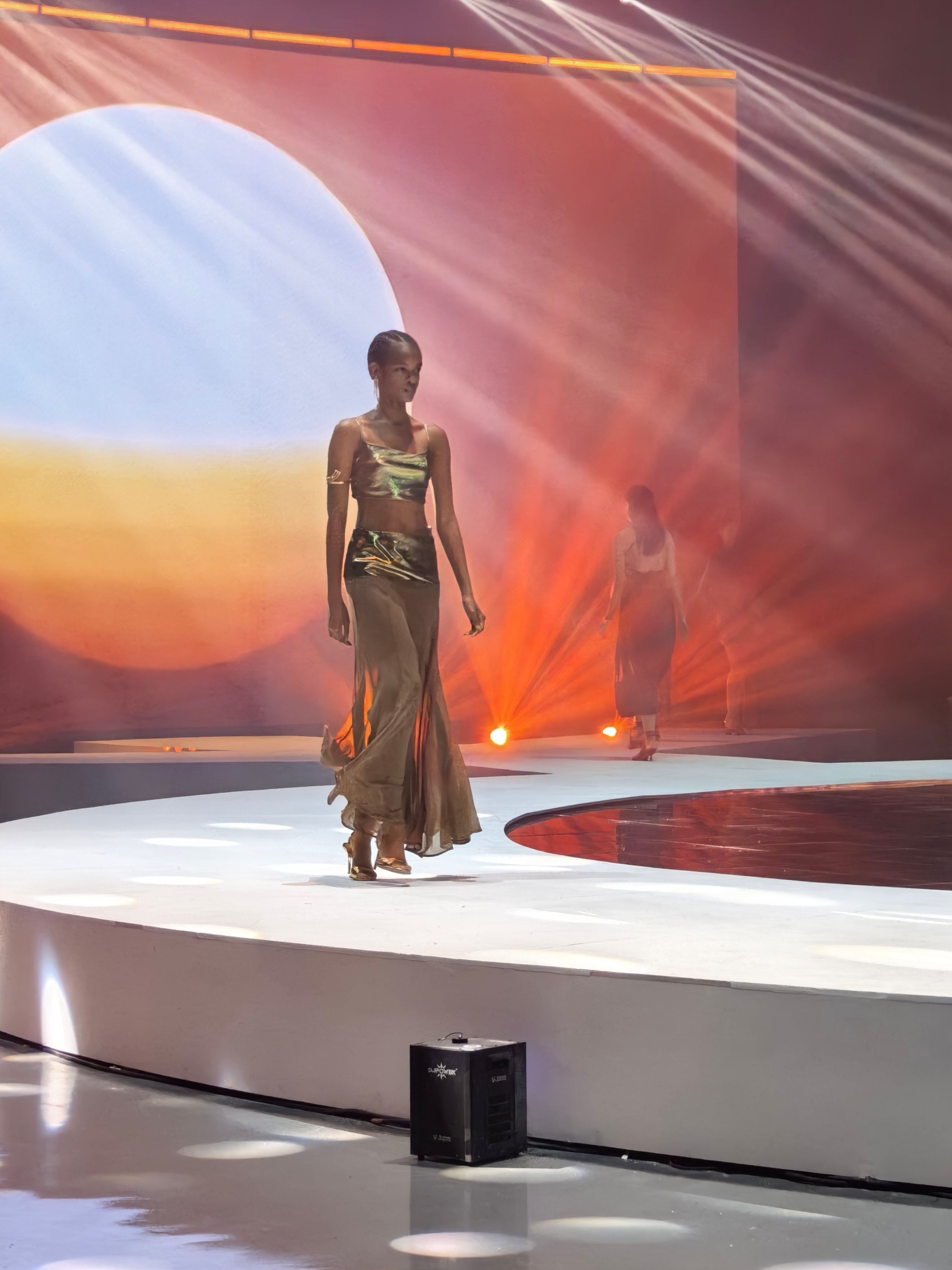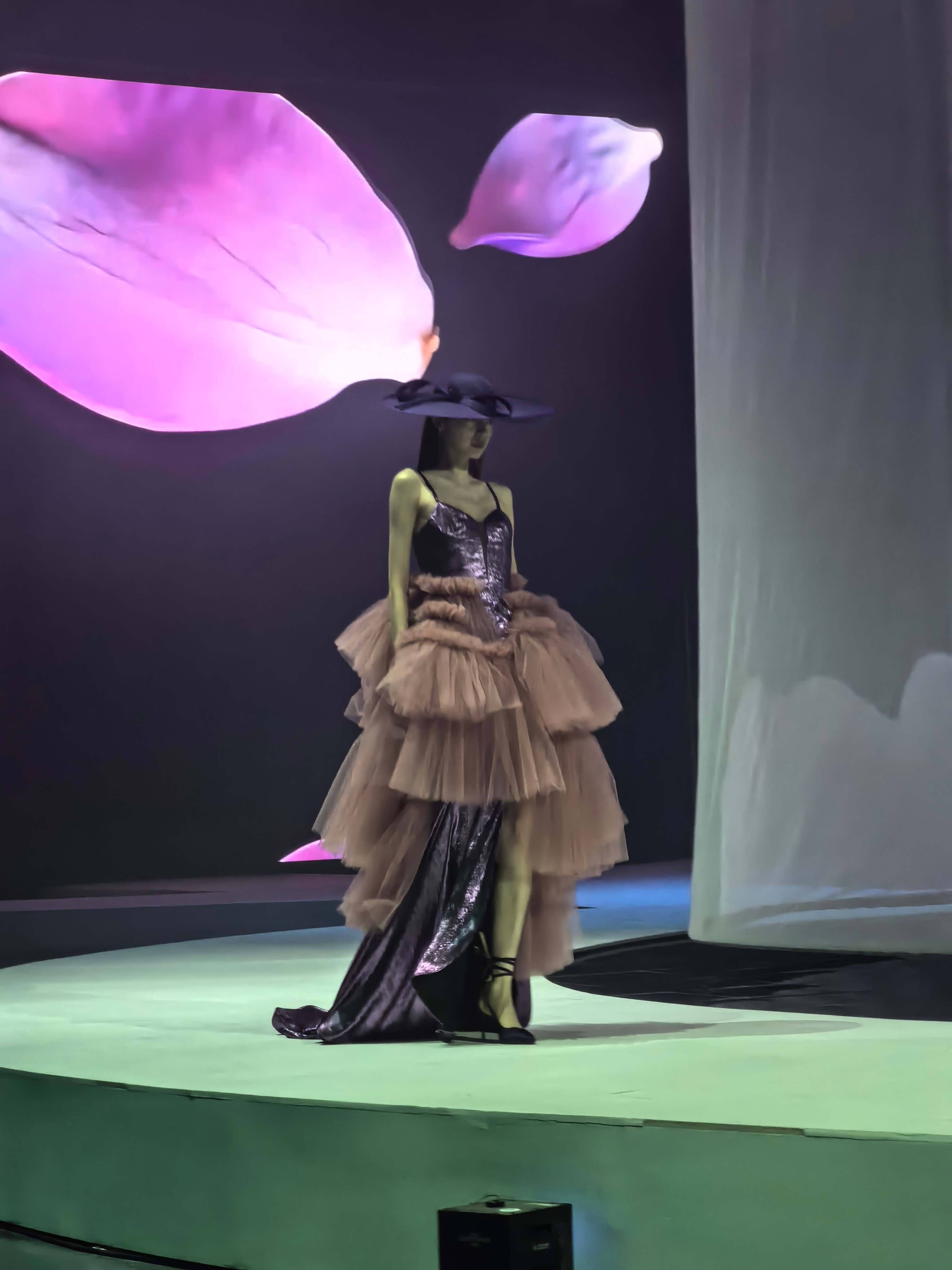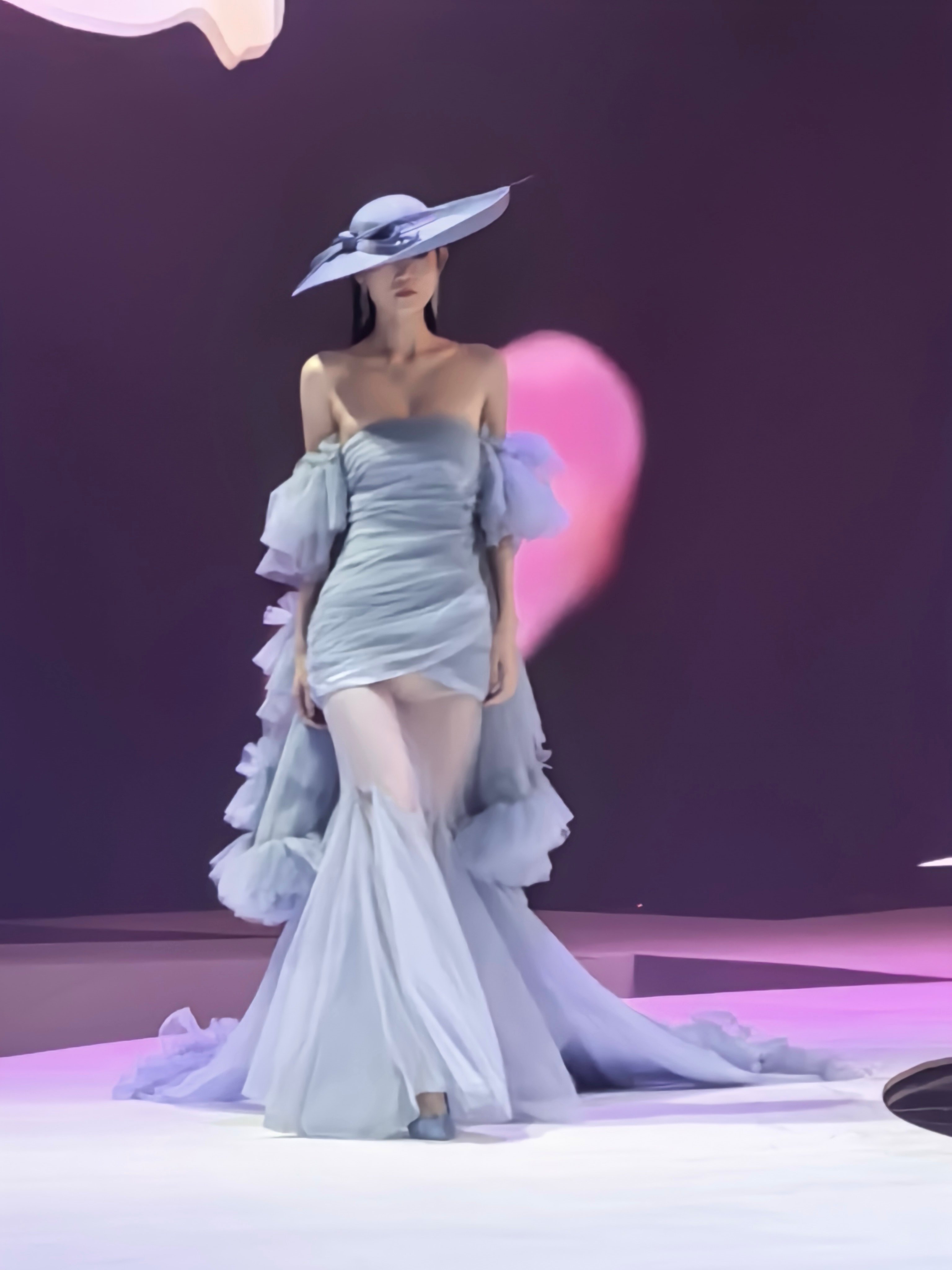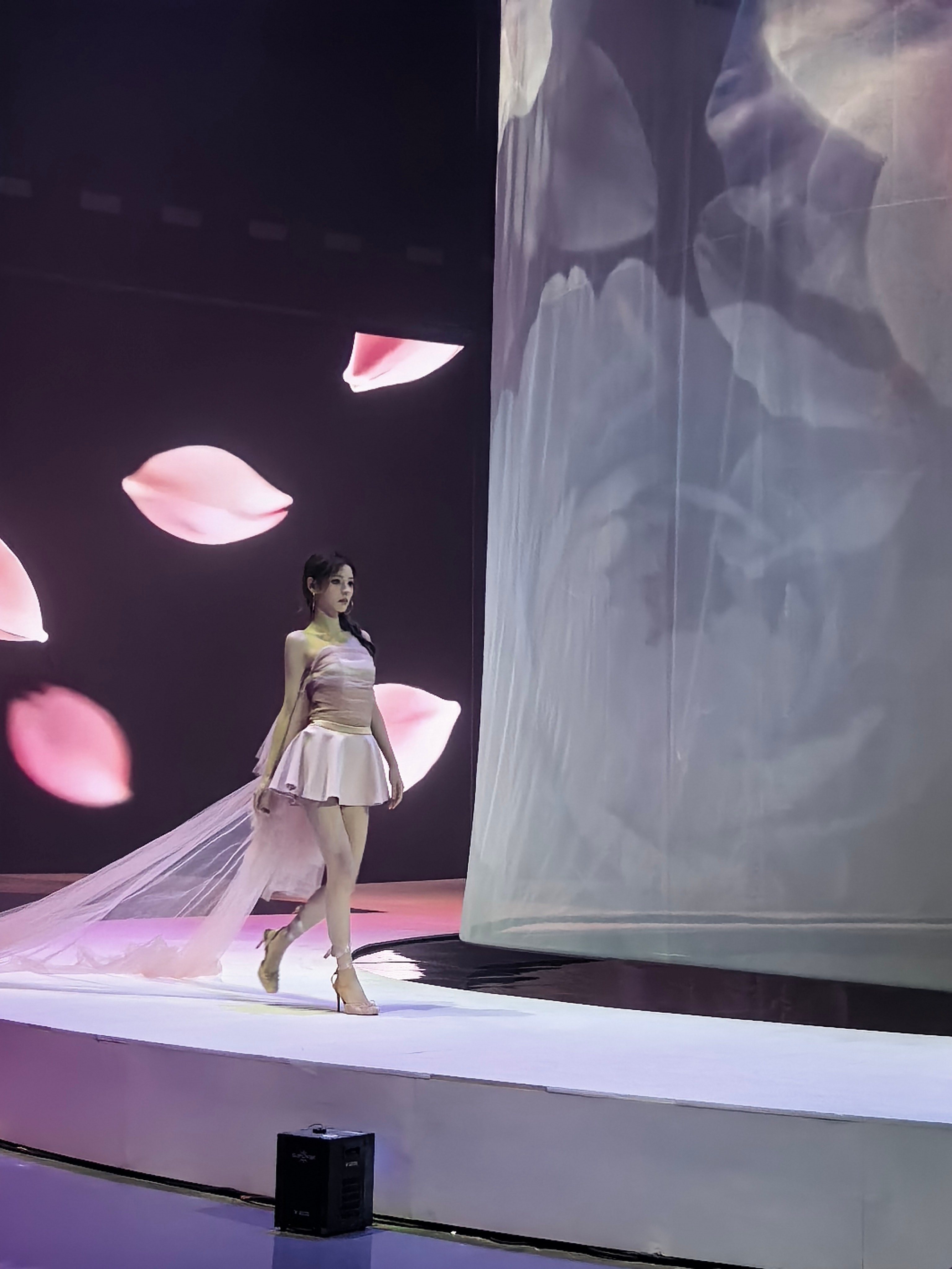 后面换的粉色抹胸纱裙又甜又灵动,拖尾设计一出场就很有氛围感,轻盈又显气质,把春夏新品那种清新、轻盈的感觉完美穿出来了。