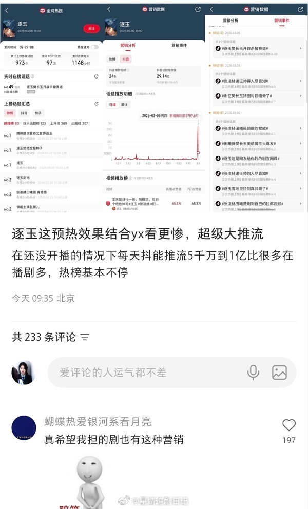 张凌赫、田曦薇逐玉 的宣发到底如何?《逐玉》的待遇也太好了点吧?!逐玉ost阵容集齐了林俊杰➕方文山➕张碧晨➕郁可唯➕张远……鹅还上线了智能倍速。有在狠狠押宝了…粉丝说这部剧无地广无大屏无固屏无推流,宣发宛如A级剧。也有人开高楼反驳说🥝和🐧都给了广告位,rs也各种推~关键抖rs很多,其实vb很便宜,抖那边真的贵,这样子感觉不止是剧方,演员自己团队也投了