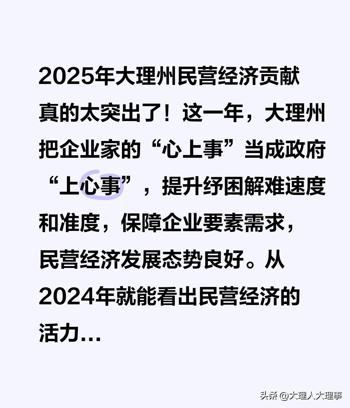 2025年大理州民营经济贡献真的太突出了!这一年,大理州把企业家的“心上事”当成政府“上心事”,提升纾困解难速度和准度,保障企业要素需求,民营经济发展态势良好。 从2024年就能看出民营经济的活力,当年大理接待游客1.1亿人次、同比增长15.46%,旅游总花费1716.6亿元、同比增长7.06%。像云南攀达航空服务有限公司打造的熊猫跳伞大理基地,就解锁了多元文旅消费场景。 大理州还从多方面贯彻《中华人民共和国民营经济促进法》,依法维护民营企业权益,推动民营经济提质扩量,未来肯定会越来越好!