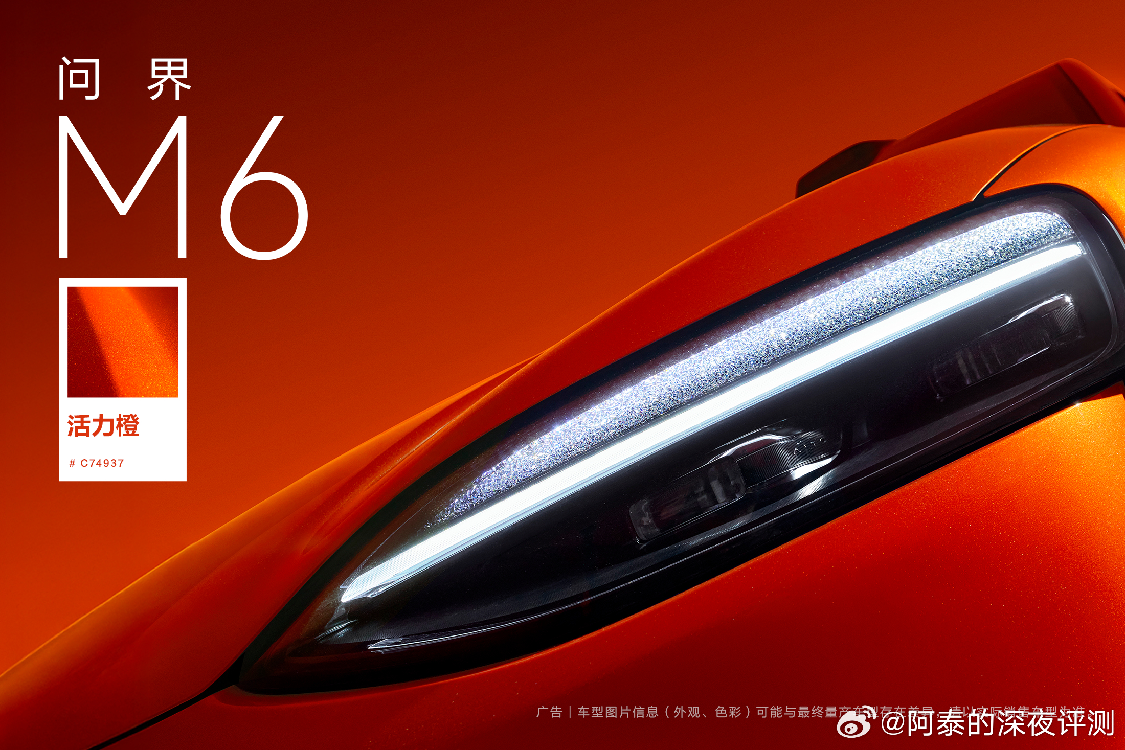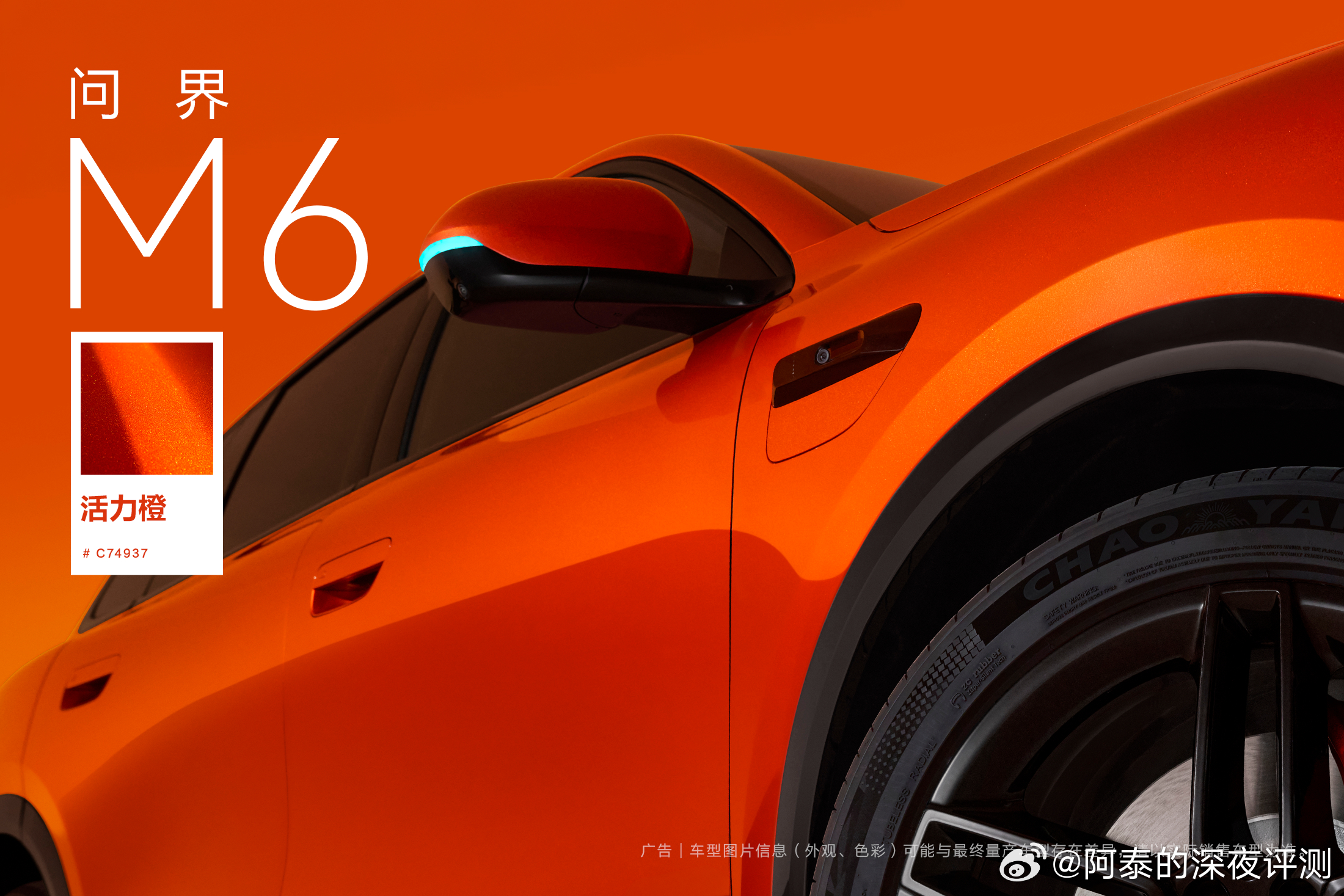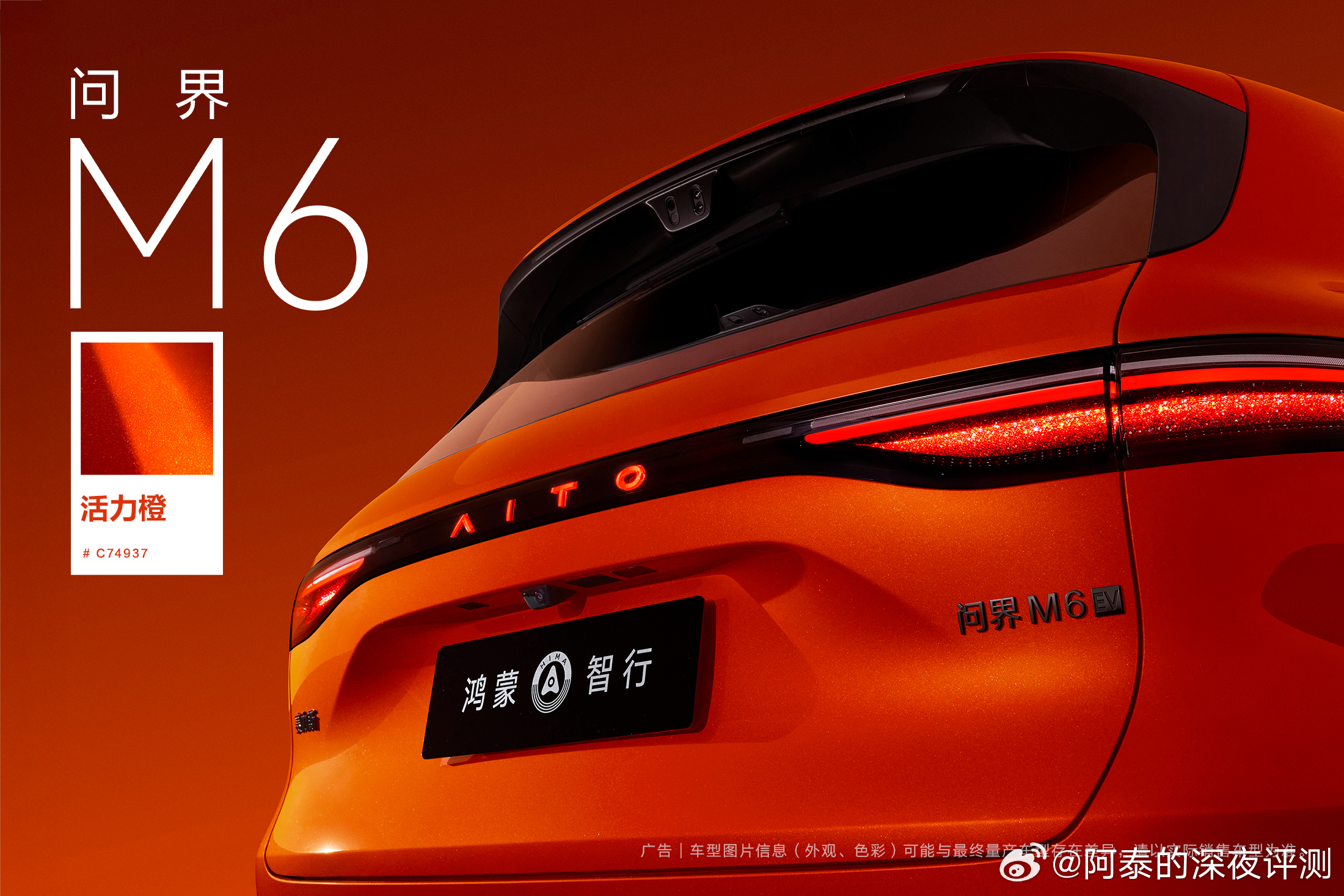 问界M6 全新「活力橙」配色,前几天发了M6视频,很多人就对橙色很喜欢,高饱和度纳米色浆搭配高亮铝粉,年轻活力!新锐王牌问界M6七色亮相
