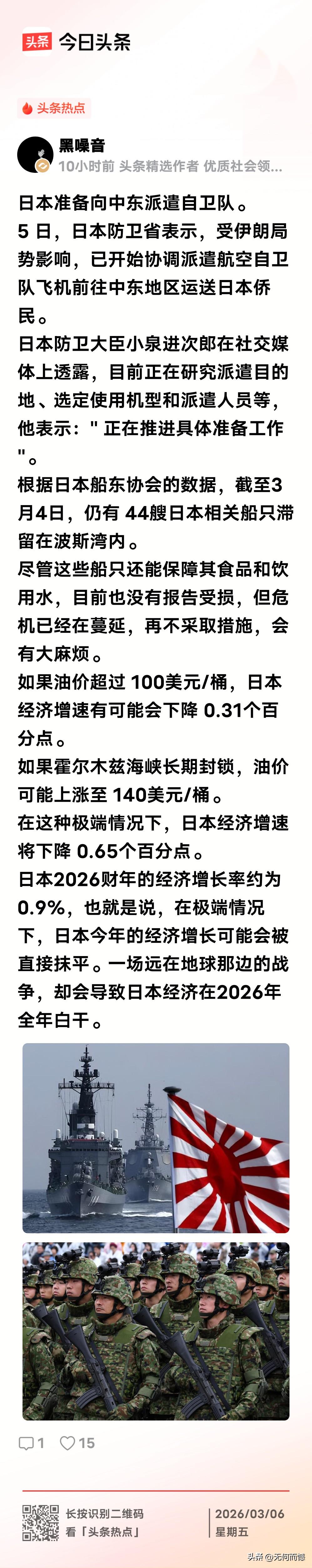 日本计划向中东派自卫队,冠冕堂皇的理由是为了保证日本侨民的安全,实际上它们到底安的是什么心,也许只有它们自己最清楚,如果日本胆敢派兵进入伊朗的话,这事情可就闹大了,这场战争的波及面将越来越大,形势会变得越来越复杂,恐怕会出现失控的状态!