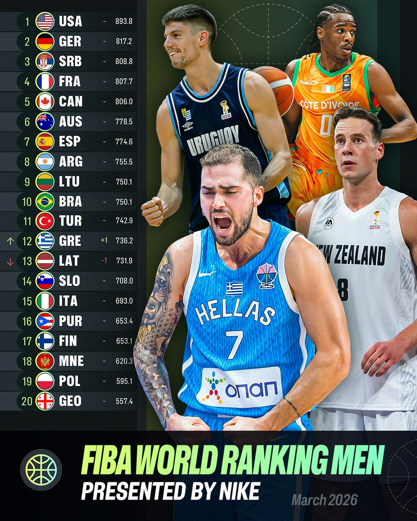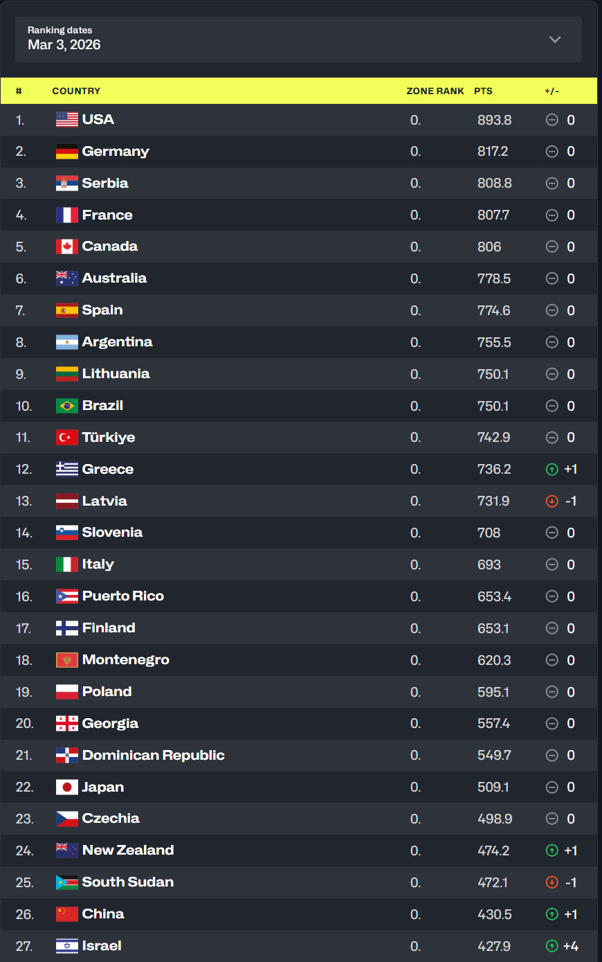FIBA更新了男篮最新世界排名!美国、德国、塞尔维亚、法国、加拿大分列前五。