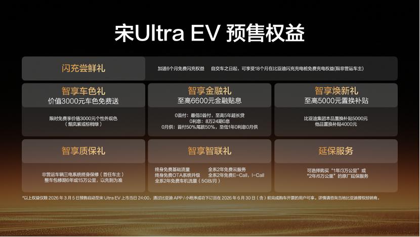 3 月 5 日,比亚迪正式发布全新第二代刀片电池及闪充技术,王朝网同步推出全新 B 级闪充 SUV 宋 Ultra EV 。共 4 款版型,官方预售价区间15.5 万元 - 18.5 万元,3月底正式上市。作为比亚迪王朝网重磅新品,宋 Ultra EV 全系标配第二代刀片电池及闪充技术,以颠覆性的补能体验、越级产品实力,正式引领 B 级纯电 SUV 进入闪充时代。 作为可能是搭载闪充技术最入门的产品,宋 Ultra EV在15我的价位,彻底破解纯电车型补能与续航的核心痛点。其搭载的闪充技术可实现 5 分钟将电量从 10% 充至 70%、9 分钟从 10% 充至 97%,即便在零下 30℃的极端低温环境,充电时间仅需多花 3 分钟,让充电拥有媲美加油的便捷性。同步搭载的第二代刀片电池,在延续极致安全标准的同时进一步提升能量密度,助力新车实现最高 710km 的 CLTC 纯电续航,充分覆盖城市通勤与长途自驾全场景出行需求。 智能与驾控维度,宋 Ultra EV 可选装激光雷达,整车搭载 27 个传感器,配合融入强化学习能力的天神之眼 5.0 系统,可从容应对窄巷通行、窄路多把掉头、城区拥堵绕行等复杂场景,带来拟人化的智能驾驶体验。驾控层面,新车搭载最大功率 270kW 的驱动电机,最高车速可达 210km/h;全系标配云辇 - C 智能阻尼车身控制系统,搭配前麦弗逊 + 后五连杆独立悬架,兼顾操控质感与乘坐舒适性,更有 TBC 高速爆胎稳行系统加持,可实现 140km/h 高速爆胎下的车身稳定控制,全方位筑牢出行安全防线。 空间与配置上,宋 Ultra EV 凭借 2840mm 超长轴距打造越级 B 级大五座空间,全系标配 15.6 英寸中控大屏、四音区语音交互、前排座椅通风加热按摩、女王副驾等 20 余项核心配置,同时提供 6 种外观配色与 2 款内饰配色,满足用户多元化审美需求。 预售权益方面,2026 年 3 月 5 日预售启动至新车上市当日 24 点下订、且 6 月 30 日前完成购车开票的用户,可享 18 个月免费闪充、至高 6600 元金融贴息、至高 5000 元置换补贴、价值 3000 元个性车色免费送,以及首任非营运车主三电系统终身保修等多重礼遇。