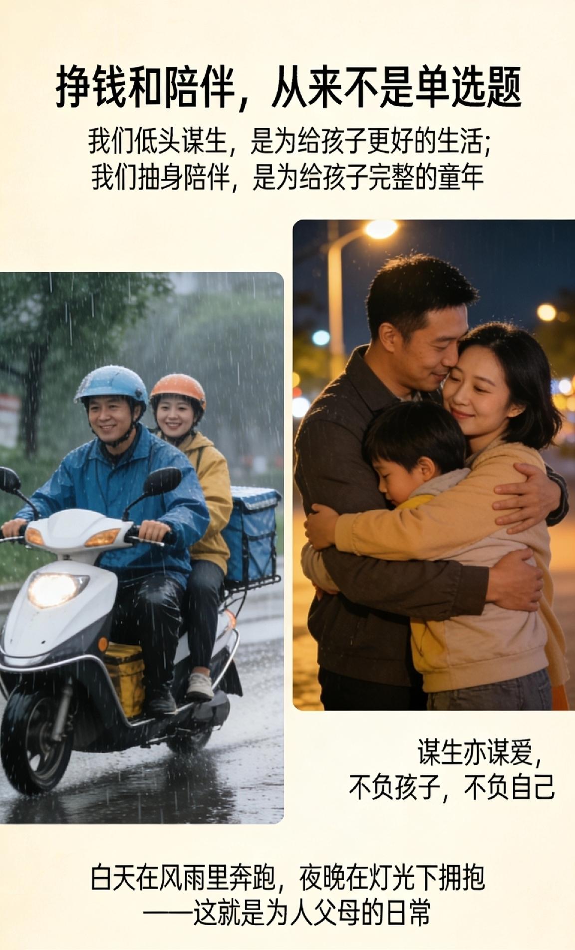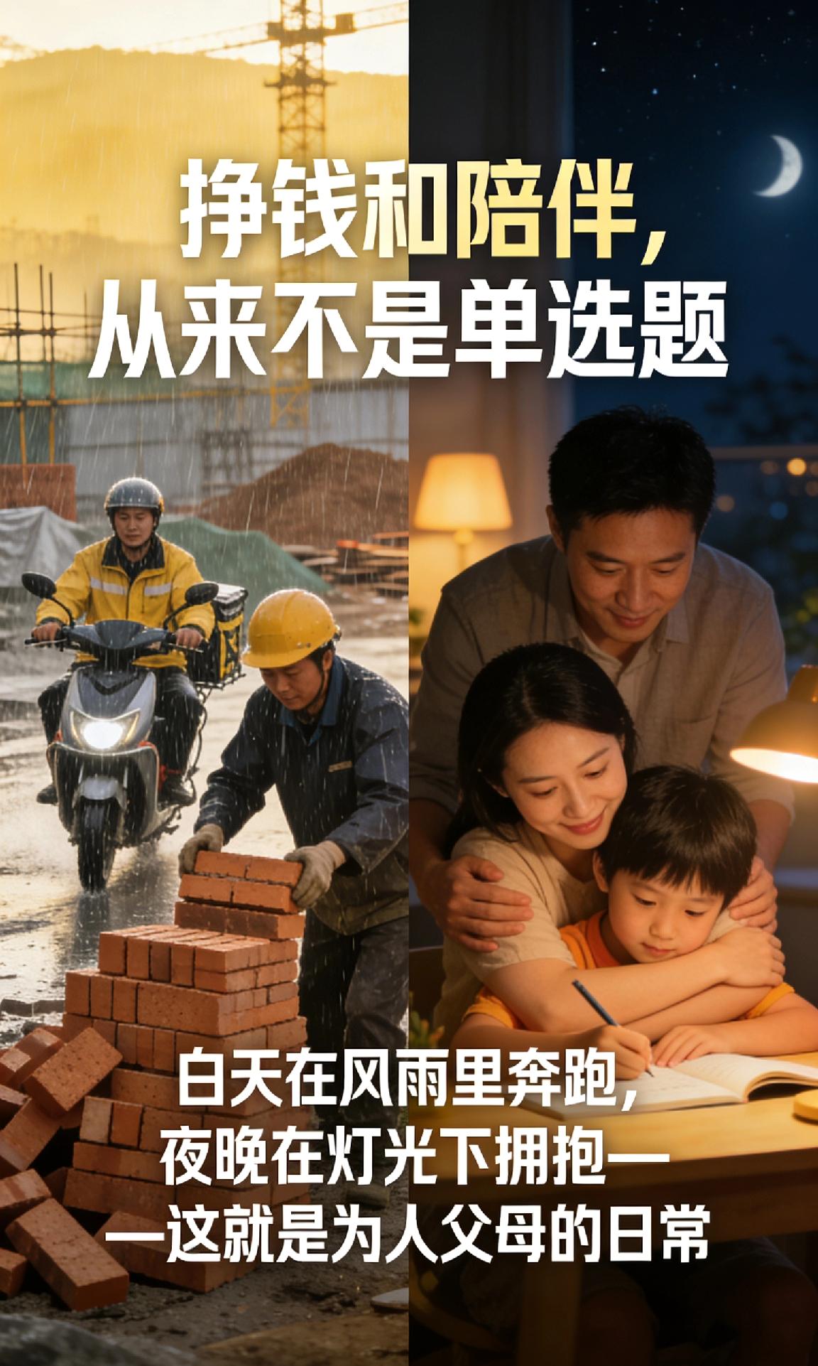 挣钱和陪伴,从来不是单选题。 我们低头谋生,是为给孩子更好的生活;我们抽身陪伴,是为给孩子完整的童年。白天在风雨里奔跑,夜晚在灯光下拥抱——这就是为人父母的日常。 平衡很难,尽力就好。不必为偶尔的缺席自责,也不必为短暂的离别愧疚。孩子终会明白,父母的双手既要托起生活,也要托起爱。 愿所有奔波的父母,谋生亦谋爱,不负孩子,不负自己。 教育孩子和挣钱 父母的责任