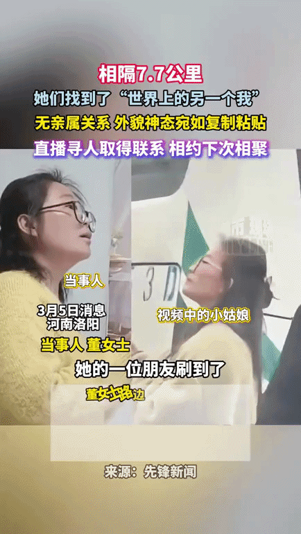 女子在路边遇到一位女孩,旁边的家人朋友当时就傻了,因为她与这位女孩实在是太像了,后来她想找到女孩,但当时并没有留联系方式。 无意之间女子想到了直播寻人,没想到3天后还真找到了,是女孩的一位朋友刷到的,随后两人就联系上了,女子非常的激动开心。 经过询问了解,原来女孩正在新加坡读博士,但是两人的家离得很近,仅相距7.7公里,还时常去赶同一个集市,不过并没有亲属关系。 两人约定半年后,等女孩回国后再相聚,虽然没有什么特别意外的发现,但茫茫人海中,两个长得这么像的人能碰到一块,也算是一种缘分。 其实长得特别像的人很多,这也不能说明两人之间一定有血缘关系,但如果都不介意的话,我觉得也可以一块去查查DNA,就当是为了消 除心中疑惑吧。 不管结果怎么样,以后就以姐妹来处,平时也可以适当地联系一下,走动走动,这样也挺好,大家说是吧? 来源:江西都市现场 河南洛阳