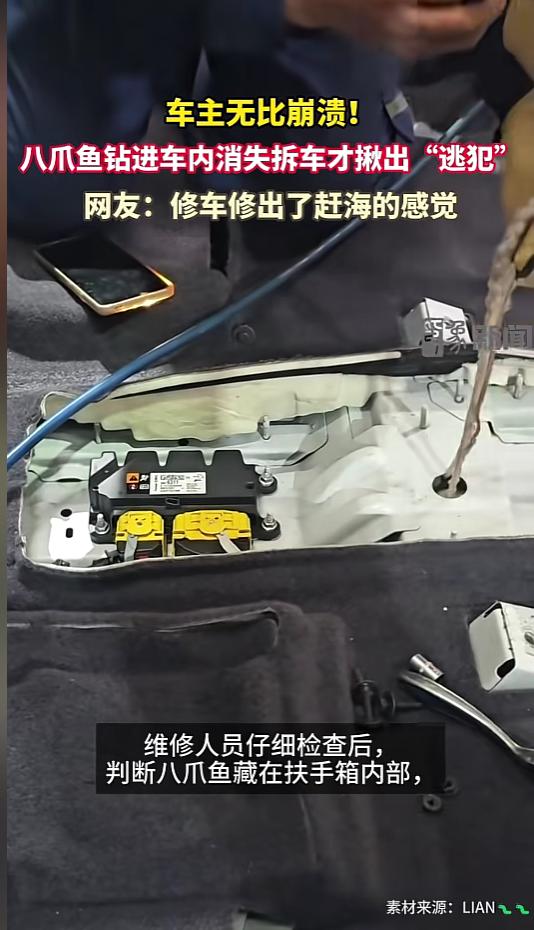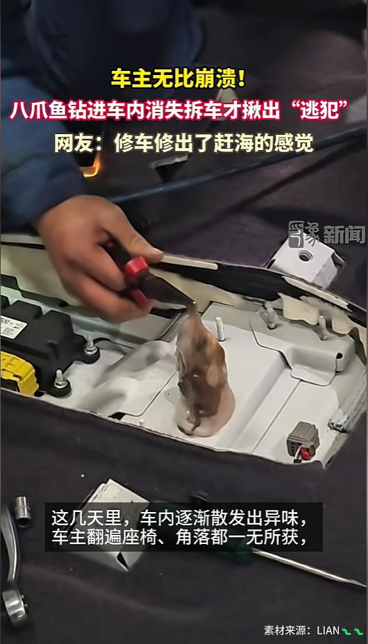 “活久见!”近日,山东聊城,一车主将购买的八爪鱼放在车内,准备回家料理了它,却没想到,八爪鱼意外挣脱,钻进车里,不见了踪影。车主苦苦寻找,也没能找到。几日后,车里逐渐发出异味,车主这才前往4S店进行求助。网友:这车还能要么? 车里最愁的就是放鱼虾等海产品,一不注意就会弄得整车都是腥味,好几月都散不干净。要是这些东西搁车上坏了,那味道更人熏人,让人闻着直发呕。 据媒体3月5日报道,该车主前几日买了条八爪鱼,放在了车里。谁知道,还没等到家处理它呢,八爪鱼自己先“越狱”了。它自己逃出了袋子,钻进了车子的缝隙里,不见了踪影。 车主发现后赶紧寻找,可他把车上都翻遍了,后备箱,座椅底下,储物盒,各个角落都找了,还是找不到。眼瞅着几天过去了,车厢里也散发出一些异味。 车主感到十分着急,这味道实在难闻,又担心会给车辆带来隐患,于是就开车去了4S店,找修理师傅寻求帮助。维修人员一番检查,确定八爪鱼在扶手箱里面,想拿出来就得拆零件。车主也同意了。 拆开车辆部件后,果然发现了八爪鱼的踪迹。维修师傅用夹嘴钳,伸进扶手箱内部,把八爪鱼夹了出去。这八爪鱼虽然死了,可是柔韧性实在太好,拽出去好长一段才完全取出来。也许是味道实在太冲了,取出的过程中,维修师傅几次险些忍不住吐了出来。 网友看后表示,实在是太难为师傅了,修了这么多年车,怕是第一次遇到这种情况。想想那味道,就呕。。。。。。! 信息来源:《近日,山东聊城一车主的八爪鱼逃入车内失踪3天,车内散发异味。车主无奈求助4S店,维修人员拆开扶手箱后成功找到。网友戏称:修车修出了赶海的感觉。》印象新闻