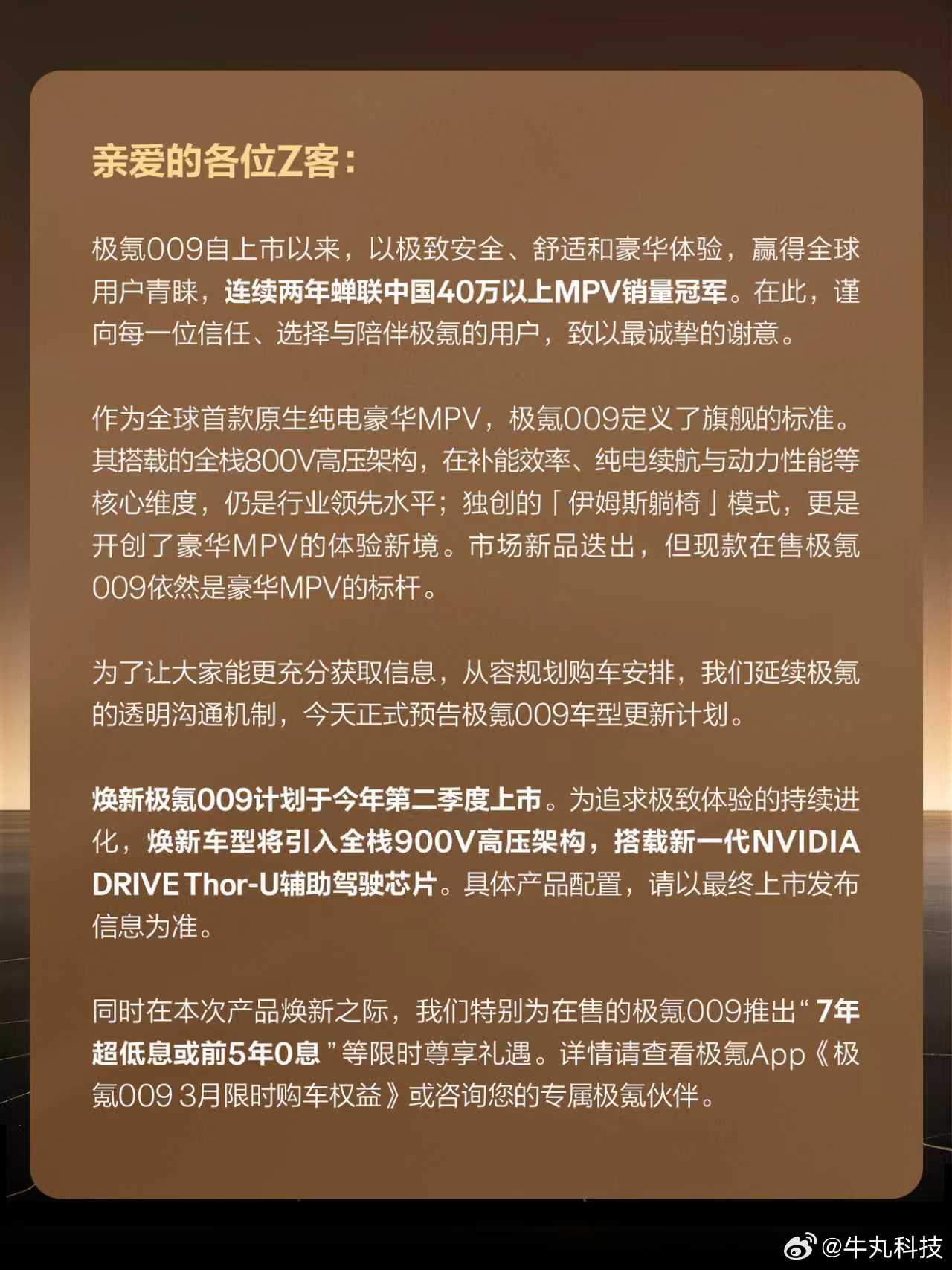 极氪009二季度焕新计划正式官宣啦!新车将搭载900V高压架构+Thor-U芯片,直接再树行业新标杆!现款车型实力照样能打~作为首款800V新能源MPV,零百加速、快充表现同级领先;