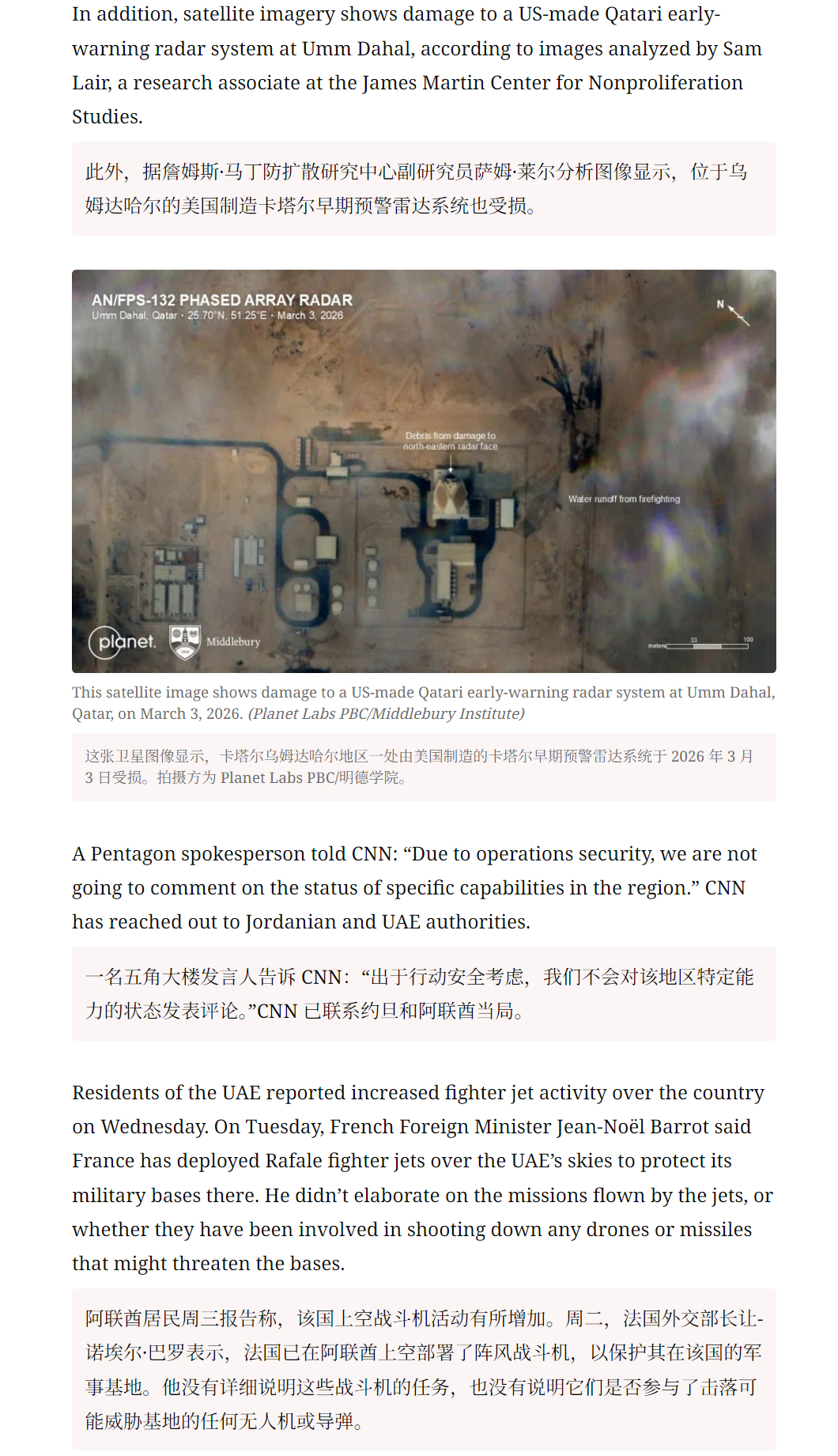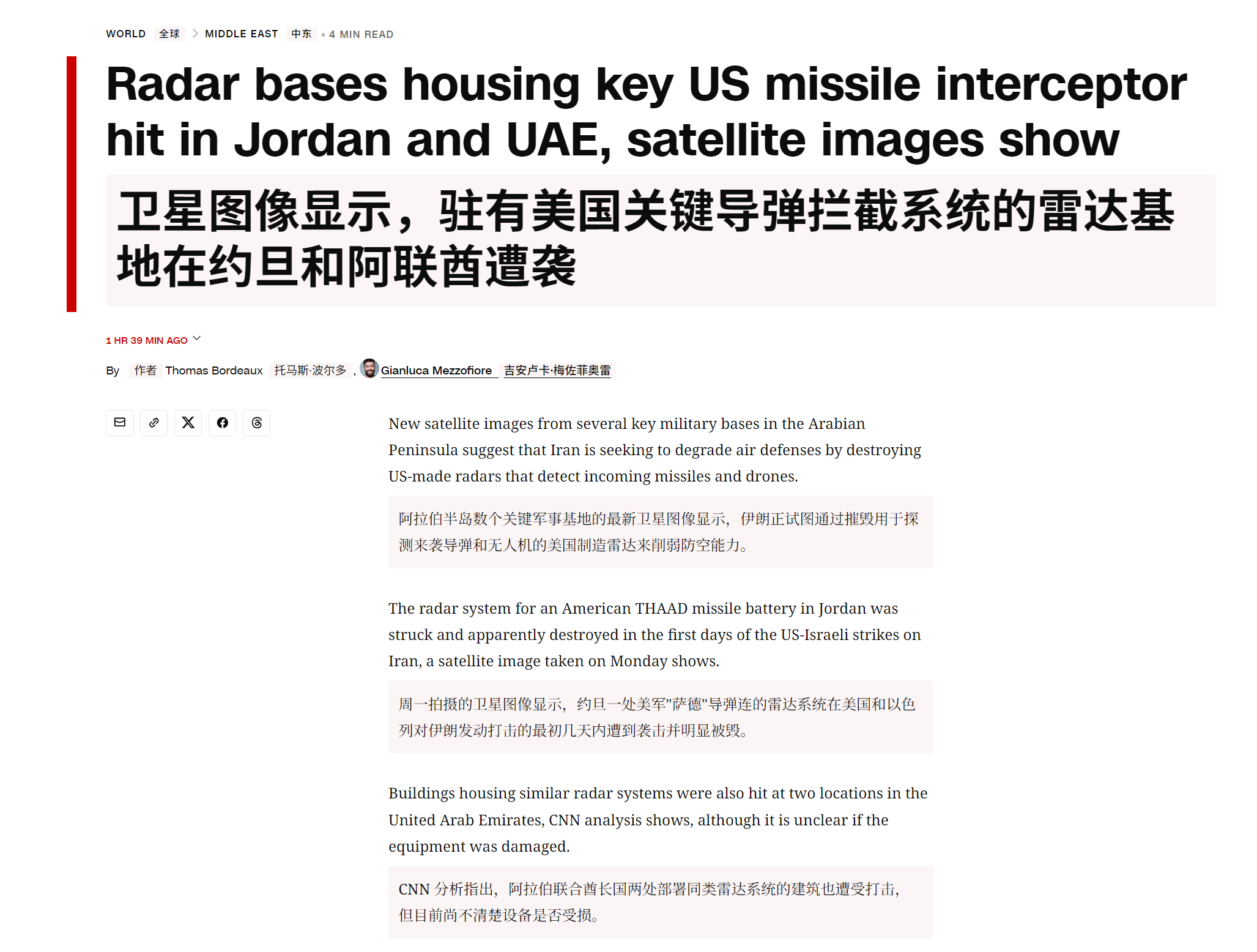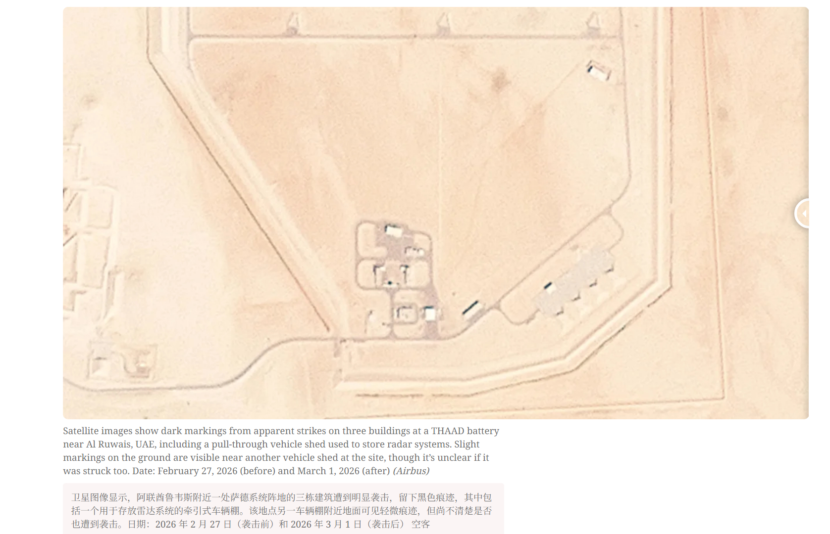 🔻CNN:卫星图像显示,驻有美国关键导弹拦截系统的雷达基地在约旦和阿联酋遭袭。🔹周一拍摄的卫星图像显示,约旦一处美军"萨德"导弹连的雷达系统在美国和以色列对伊朗发动打击的最初几天内遭到袭击并明显被毁。🔹美国部署了八套萨德系统,阿联酋部署了两套,沙特阿拉伯部署了一套。这套位于约旦穆瓦法克萨尔提空军基地的萨德系统距离伊朗超过 500 英里。🔹雷达是高端导弹拦截系统的核心组成部分,萨德系统的雷达是 AN/TPY-2 型可运输雷达,由雷神公司制造。根据 2025 年导弹防御局的预算,该雷达的成本略低于 5 亿美元。🔹2026 年 3 月 2 日的卫星图像显示,约旦穆瓦法克萨尔提空军基地内,一台被烧焦的萨德雷达周围散落着残骸。空客公司提供。🔹图像显示,雷达附近的沙地上有两个 13 英尺的弹坑,这表明可能需要多次尝试才能击中该系统,该系统分布在五辆 40 英尺的拖车上。所有设备似乎都被摧毁或严重损坏。🔹这套雷达和萨德系统至少在 2 月中旬就已部署在穆瓦法克,并于 3 月 1 日或 2 日遭到袭击。该基地一直是美国军事行动的重要枢纽。在冲突爆发前拍摄的卫星图像中,停机坪上可见超过 50 架战斗机,以及无人机和运输机。数十个机库很可能还隐藏了更多飞机,避开了卫星的侦察。🔹在与伊朗战争爆发的最初几天,这可能不是唯一被击中的萨德雷达。🔹2 月 28 日至 3 月 1 日期间,阿联酋鲁韦斯附近一处军事设施至少有三栋建筑受损,萨德尔一处设施有四栋建筑受损。两地用于存放萨德系统雷达的牵引式车辆棚均遭到袭击。🔹CNN 通过卫星图像分析确认,这两处地点部署了萨德反导系统及其雷达装置,图像显示它们早在 2016 年和 2018 年就已分别存在于阿联酋的萨德尔和鲁瓦斯地区。在图像中,雷达系统的组件经常可见于车辆棚外。🔹CNN 暂无法确认这些导弹防御基地使用的是美军所属的萨德系统,还是阿联酋购入的两套设备。由于缺乏高分辨率卫星影像,无法确定袭击发生时雷达系统是否在场。卫星图像显示,阿联酋萨德尔附近一处萨德阵地有四座建筑遭明显袭击留下黑色痕迹,其中包括两个用于存放雷达系统的贯通式车辆棚。袭击模式与鲁瓦斯基地的情况几乎完全相同。时间标注:2026 年 2 月 27 日(袭击前)与 2026 年 3 月 1 日(袭击后),via Planet Labs PBC🔹弹药专家、研究公司 Armament Research Services (ARES) 主任 N.R. 詹森-琼斯告诉 CNN,这种雷达无法轻易更换,并称这是一次重大损失。🔹此外,据詹姆斯·马丁防扩散研究中心副研究员萨姆·莱尔分析图像显示,位于乌姆达哈尔的美国制造卡塔尔铺路爪早期预警雷达系统也受损。🔹一名五角大楼发言人告诉 CNN:“出于行动安全考虑,我们不会对该地区特定能力的状态发表评论。”CNN 已联系约旦和阿联酋当局。🔹阿联酋报告称,自战争开始以来,其领土遭受的导弹袭击数量大幅减少,从战争首日周六的 137 枚降至周四的 7 枚。🔹然而,无人机袭击的频率依旧持续,目前已构成针对阿联酋的大多数攻击。阿联酋在其扎夫拉基地驻有美军,已成为海湾地区遭受攻击最频繁的阿拉伯国家之一,承受了 1072 次无人机和 196 次弹道导弹袭击。🔻民主党媒体开战以来用较高的专业水准和极大的热情分析卫星图片,力图证明美军高价值技术设备在伊朗的袭击中损失惨重。🔻甚至比伊朗媒体更加注满了热情,都快溢出来了。🔻媒体纪律性这一块,妙啊。伊朗称成功突破以色列七层防御 海外新鲜事 伊朗报复美以 中东现场直击
