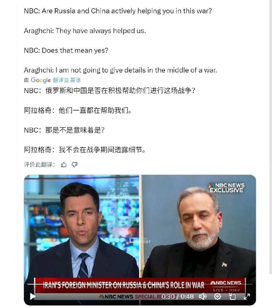 伊朗外长没说中俄帮它打仗,网上那段NBC采访是假的。查了一圈,正规媒体根本没这回事,连伊朗外交部官网都没提过。 最近网上疯传阿拉格齐在NBC上滴水不漏地回应中俄援助问题,其实压根没这采访。CNN、福克斯、NBC自己都搜不到视频和文字稿。伊朗官方也一直强调反击全是自己干的,没找别人帮忙。 中国和俄罗斯也早说了,不向伊朗提供武器,也没参与这次冲突。俄伊搞过海军演习,但那是早前安排好的,没实弹也没联合指挥。中国更是一直在联合国推动谈,连原油采购都按规矩来。 阿拉格齐最近几次出镜,聊的全是导弹射程、核谈判、自卫合法性这些。他反复讲伊朗能自己搞定,不是吹牛,是真把地下工厂、无人机部队、防空系统都列过清单了。 美国天天说伊朗背后有“大靠山”,可情报机构到现在也没掏出一张清晰照片或一段通话记录。所谓“中俄暗中支援”,听着挺带感,实际连个边都没沾上。 网上传得越玄乎,越得翻翻官网、看看外媒原始报道。不然光听二手话,脑子容易被带偏。 真假难辨,信息太多,干脆别信没出处的。