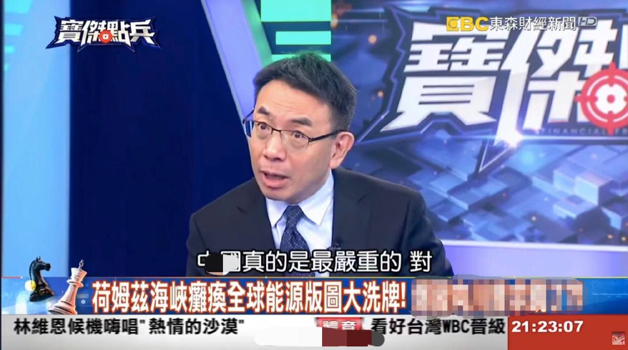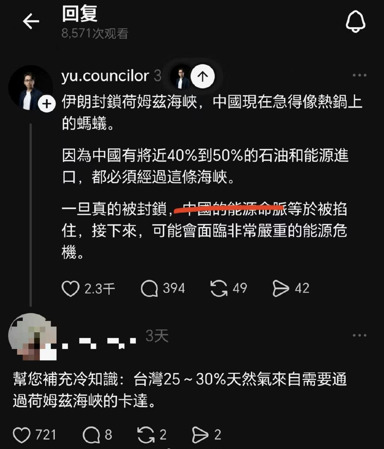 台湾民进党桃园市议员余信宪表示:伊朗封锁霍尔木兹海峡,石油运输瘫痪,全球能源面临大洗牌,而在石油危机上,大陆真的是最严重的,大陆现在急得像热锅上的蚂蚁,因为大陆有将近40%到50%的石油和能源进口,都必须经过这条海峡,一旦真的被封锁,那大陆的能源命脉等于被掐住了,接下来可能会面临非常严重的能源危机。