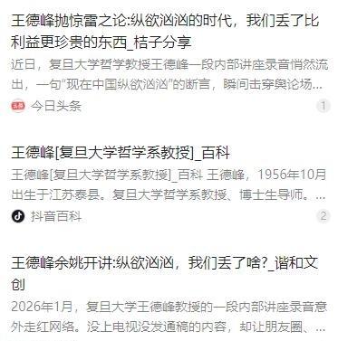 复旦大学教授王德峰,再次抛出惊人“言论”!他表示,今日之中国纵欲汹汹,各种欲望,各食其能,各谋其力,如果一个民族的民风,伴随着重功利、轻道义,这个民族将内不能安,外不能立……。字字诛心,振聋发聩! 每个人都拼了命往前冲,赚更多钱、抢更好机会、比谁混得更风光,可心里总空落落的,总觉得少了点什么。王德峰教授这番话一出口,直接把这层窗户纸捅破了:欲望到处都是,大家各显神通、各奔前程,本来挺正常,可要是民风只盯着功利,把道义扔一边,那麻烦就大了。内部人心散了,外部也站不稳脚跟。这话听着扎心,却句句戳中现实。 现在很多人活得像在赛跑,眼睛只盯着终点线上的奖金和名次。工作上算计回报,交朋友先掂量有没有用,谈恋爱也得看条件够不够硬。结果呢?钱包鼓了,心却越来越冷。社会上到处是互相提防,信任越来越稀缺。谁帮谁都得先问“图啥”,谁都不敢轻易相信别人,生怕吃亏。长此以往,大家表面客气,背地里防着点,谁也不肯真心付出。这样的氛围下,家庭关系变味,职场勾心斗角,公共领域也乱成一锅粥。经济跑得快,精神却跟不上,很多人赚了大钱却睡不着觉,焦虑得不行。 王德峰教授不是反对大家挣钱,他自己也说过,物质基础是必须的,逐利也没错。可问题出在边界没了,道义被甩开。欲望没节制,就成了洪水猛兽,把人淹没。过去几十年,我们从穷日子熬到今天,物质爆炸式增长,大家都松了口气。可精神层面呢?很多人迷失了方向,不知道为什么活着,只知道要更多更多。成功标准单一化,钱和地位成了唯一标尺,其他的比如善良、诚信、责任,都被边缘化了。年轻人刷绩点、卷简历、抢offer,卷到最后却问自己:这到底是为了啥?这种空虚感越来越普遍。 关键是,这不是个人问题,而是整个民风在变味。如果大家都只重眼前利益,轻视长远道义,那社会就没法稳。内部人心涣散,互相不信任,合作基础没了;外部呢?别人看你这个民族只认钱不认人,也不会真心尊重你。历史上有太多例子,物质发达却道德崩坏的国家,最后都栽了跟头。我们现在正处在关键节点,经济发展成绩摆在那,但精神建设不能掉链子。得重新找回平衡,让功利和道义并行。追求利益的同时,别忘了底线;各谋其力的时候,也得互相守望。