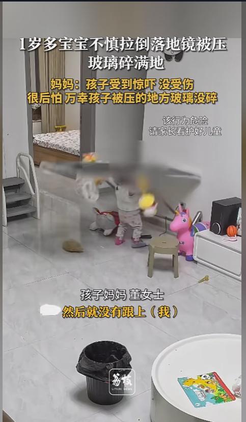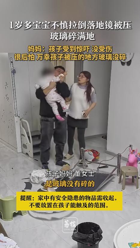 “太吓人了!”近日,山东潍坊,一岁多宝宝在屋里面玩耍,突然间将落地镜拽倒。家长来不及阻止,落地镜朝孩子倒去,压在了孩子身上,玻璃碎了一地。家长赶紧跑过去将孩子抱起来,万幸的是,砸在宝宝身上的玻璃没有碎,宝宝只受到了惊吓。 养了孩子的都知道,孩子一会跑,家里的各种东西就得好好收拾收拾,不然就都是活脱脱的定时炸弹,像桌子角,插座孔这些,指不定什么时候就给孩子带来点伤害。 据媒体3月5日报道,董女士的宝宝今年才一岁多点,事发当日,宝宝在屋里面玩耍,她在另一个屋里,丈夫在不远处看着。一个不留神,宝宝走向了墙边的落地镜,往前推了一下镜子。 镜子在宝宝的推动下旋转,重心不稳,宝宝没能扶住,镜子直接倒了下来。镜子砸在宝宝的身上,将他砸倒后又摔在了地上,玻璃渣碎了一地。宝宝的爸爸看见了,赶紧跑过来将他抱起来,董女士也听到声音,跑了出来。 幸运的是,镜子倒下时,孩子离镜子的底部比较近,没有受到太大冲击,而镜子通过宝宝缓冲了一下,接触宝宝的那头也没有碎掉。不幸中的万幸,宝宝只是受到了惊吓,并没有受伤。 尽管如此,董女士还是被吓了一跳。感到一阵阵后怕,要是孩子身上的玻璃碎了,后果不堪设想。 网友看后表示,养了孩子,家里就不能这么随便了。像这些不稳当的东西,可能被宝宝碰掉的东西,易碎的东西,都要好好收起来,不能让宝宝碰到这些带有隐患的物品! 信息来源:《1岁多宝宝不慎拉倒落地镜被压玻璃碎满地 妈妈:孩子受到惊吓 没受伤 很后怕 万幸孩子被压的地方玻璃没碎》荔枝新闻