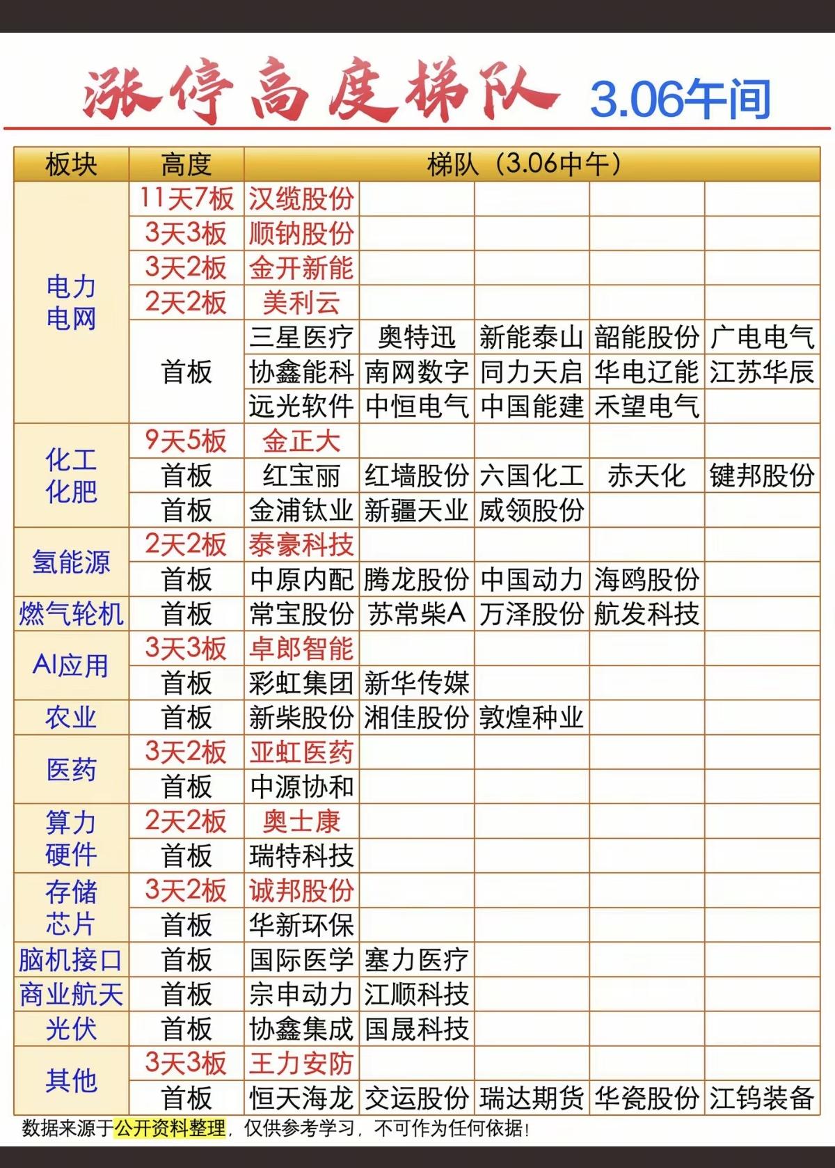 3.6周五 涨停板股票:题材+连板高度! 电力电网 18股涨停 化工原料 9股涨停 氢能源 5股涨停 燃气轮机 4股涨停 农业种植 3股涨停