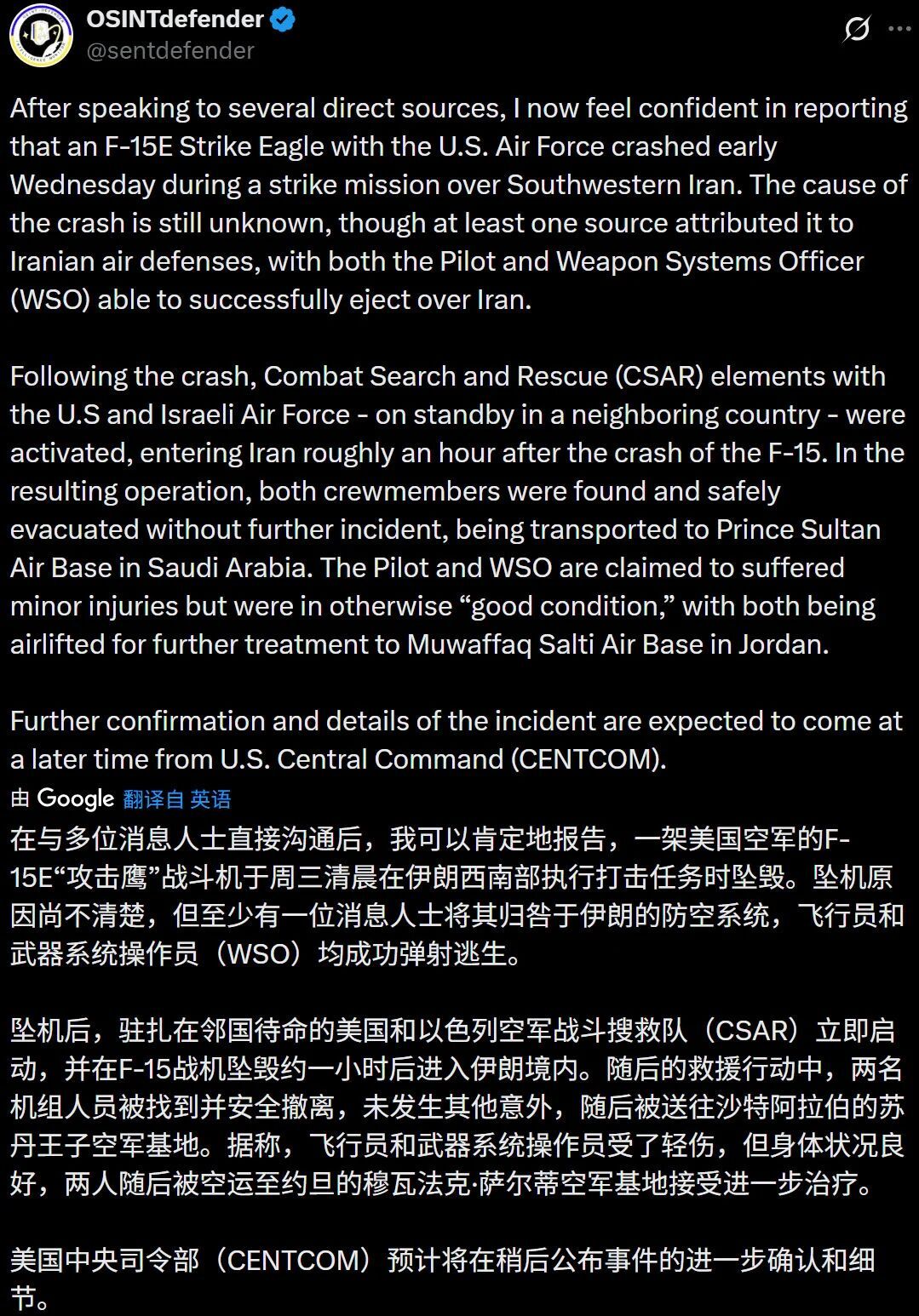 第4架F-15E被击落,伊朗防空系统斩获“首个击杀有人机战果”!