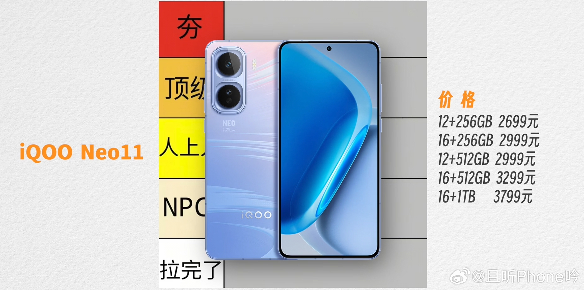 Neo11起售价2699,除了一块好屏,其它配置给的很全,8至尊+独显电竞芯片,满级防尘防水都给到了。其次在配置和手感之间平衡的也不错,还有更轻薄的玻纤版本可选,算是足够均衡的一款机型。