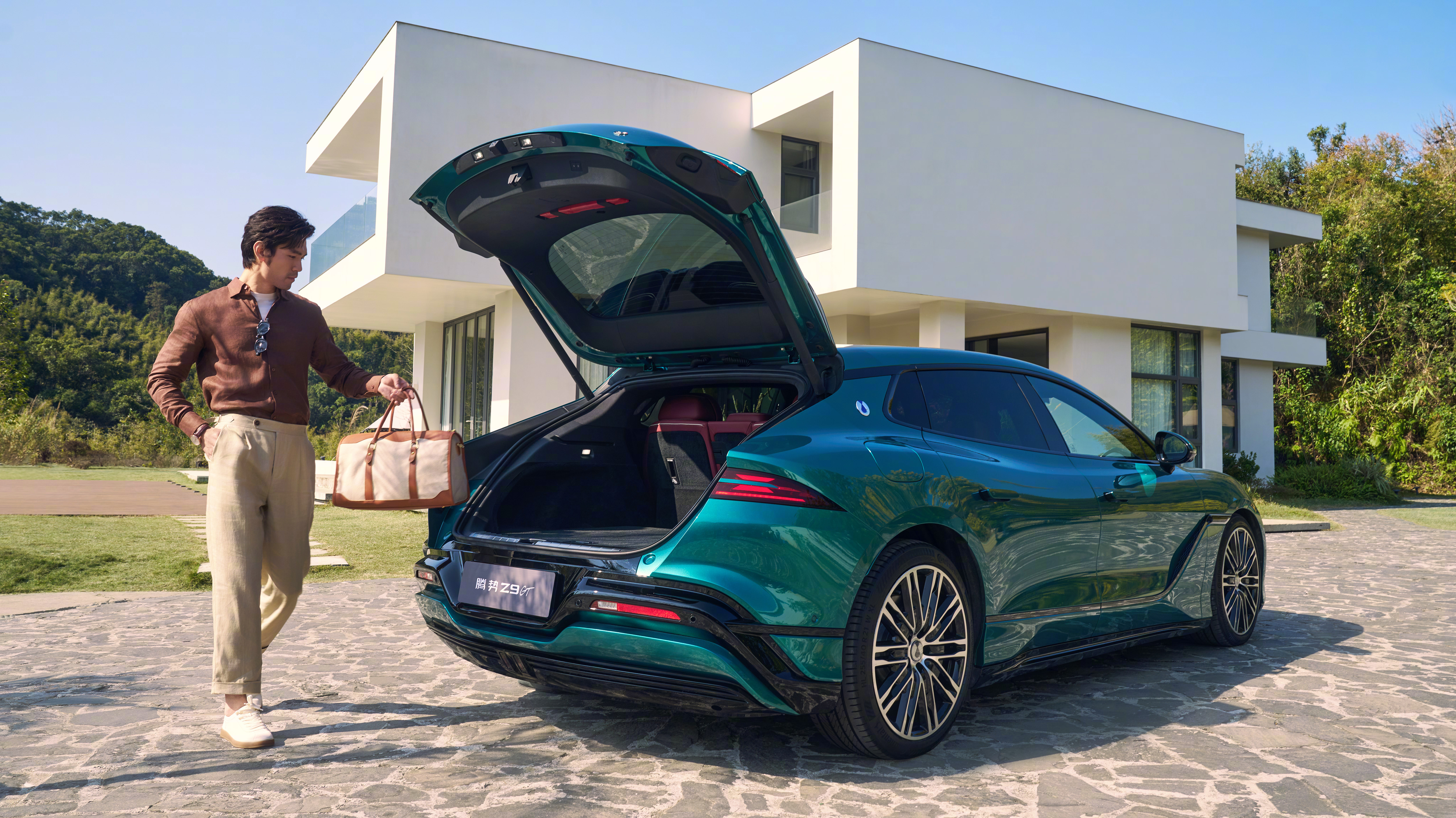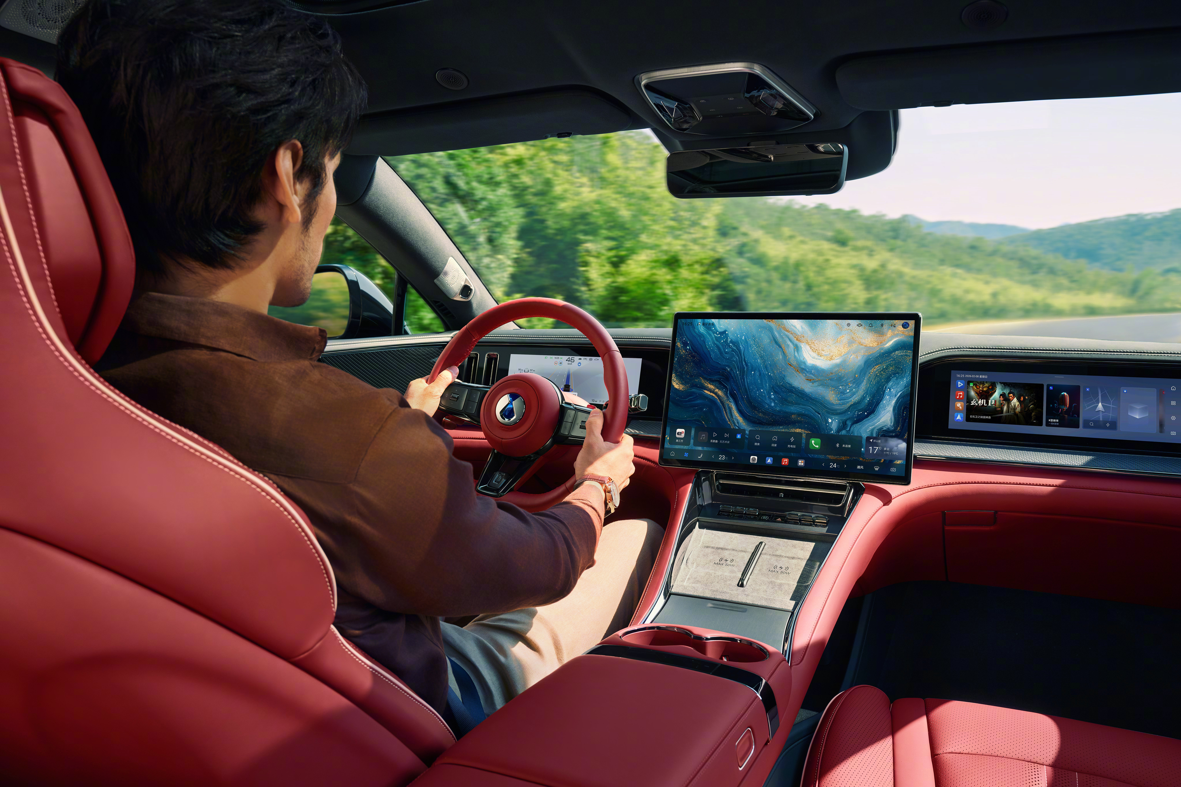 这台车定位新能源豪华GT,设计上走的是非常典型的GT比例,低趴车身加溜背姿态,气场确实有点向百万级GT看齐的意思。新车还带来了峡湾绿车色和熔岩红内饰,视觉反差很强,运动氛围一下就出来了。