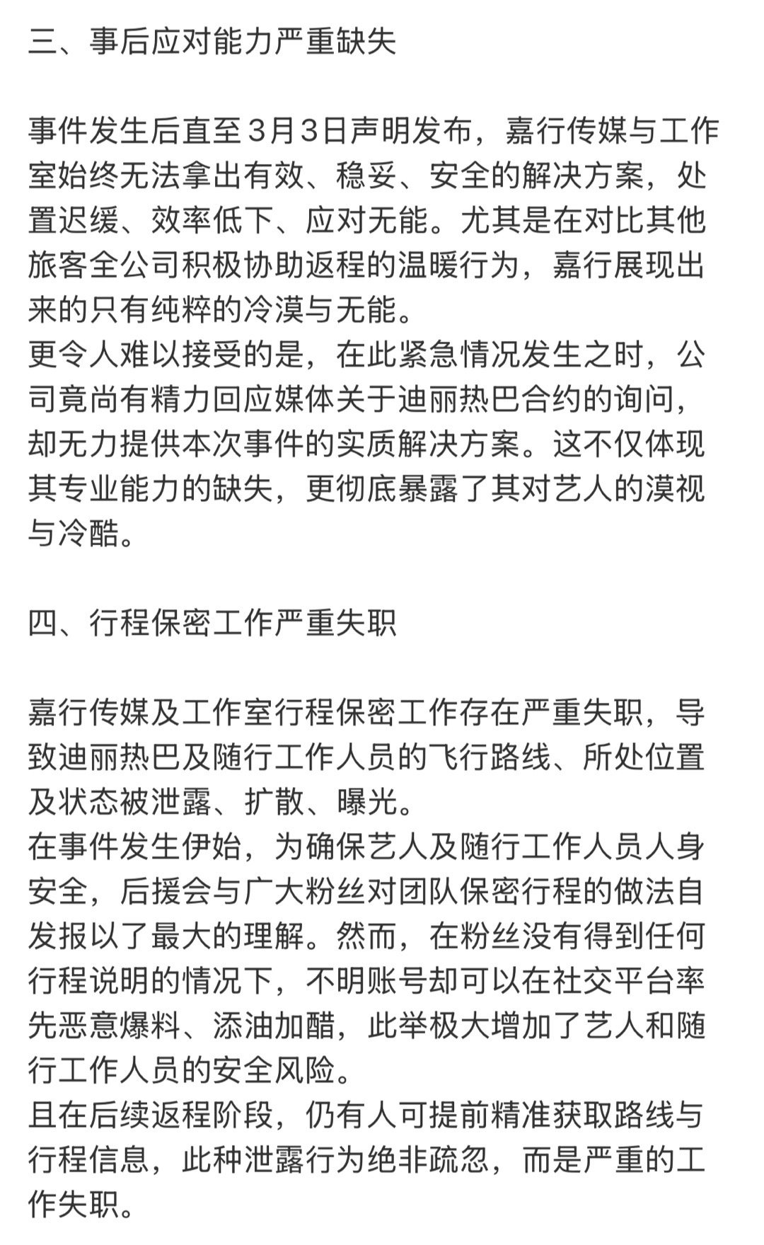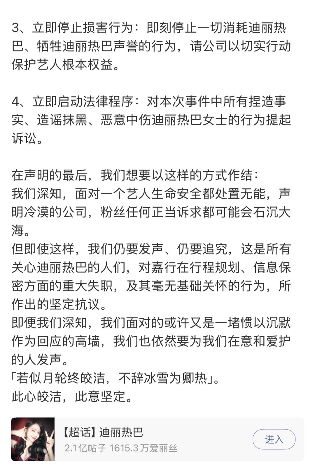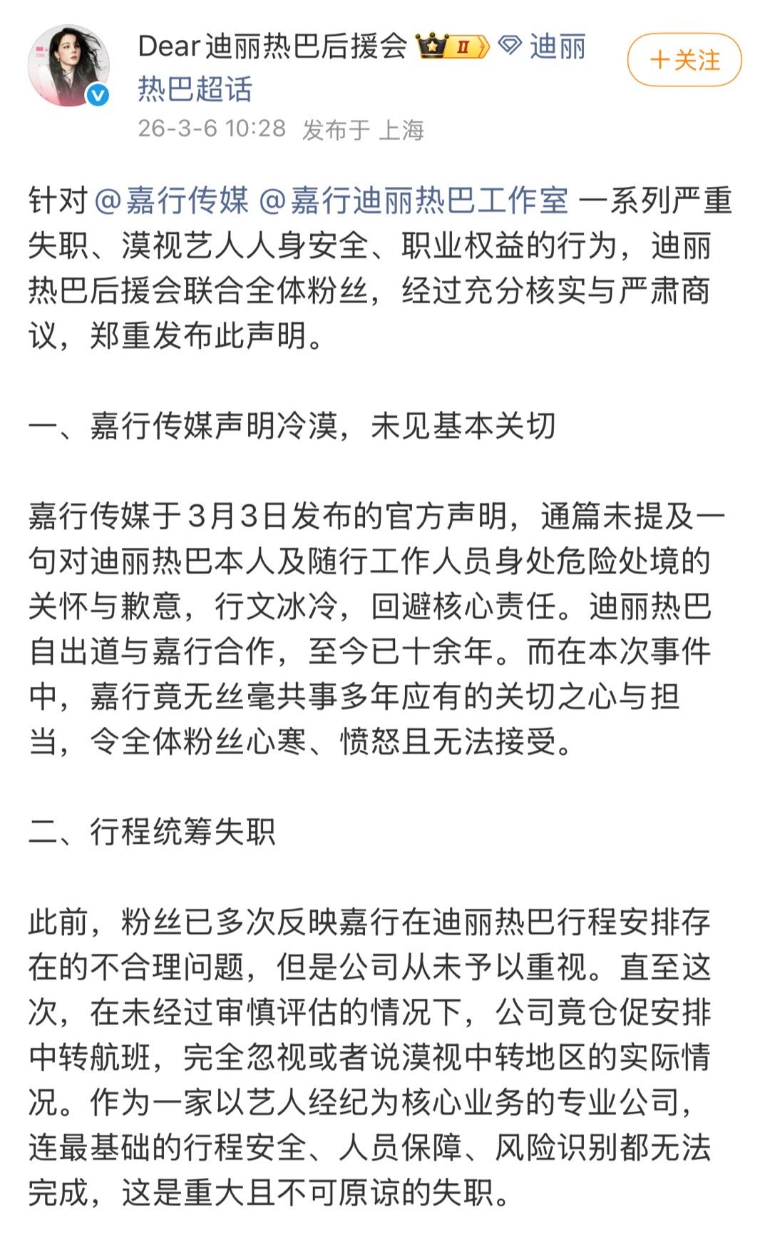 迪丽热巴粉丝发布声明,向嘉行传媒和工作室提出诉求,要求公开道歉、彻查、追责。