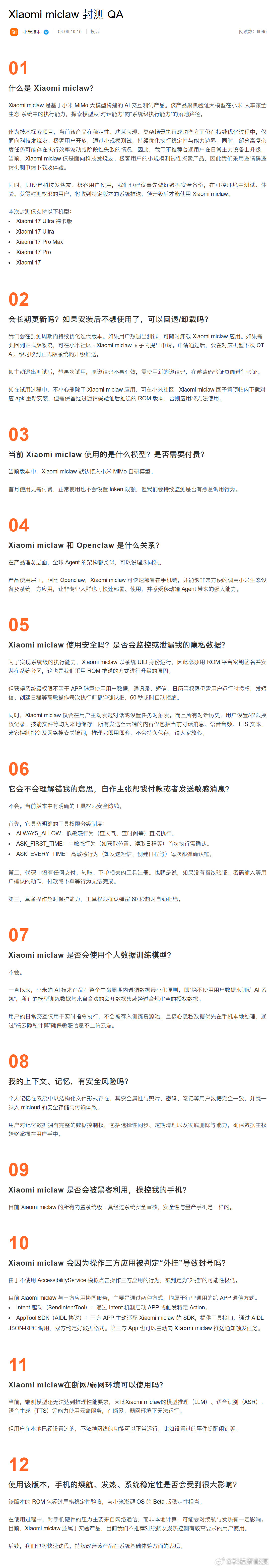 【小米手机版龙虾来了】小米今日发布移动端Agent产品「Xiaomi miclaw」,小米技术官方发文称,Xiaomi miclaw是基于小米MiMo大模型构建的AI交互测试产品,本次仅面向小米17系列极客及科技发烧友用户,通过邀请制进行小范围封测。据了解,Xiaomi miclaw是国内首个手机端“类OpenClaw”Agent应用。