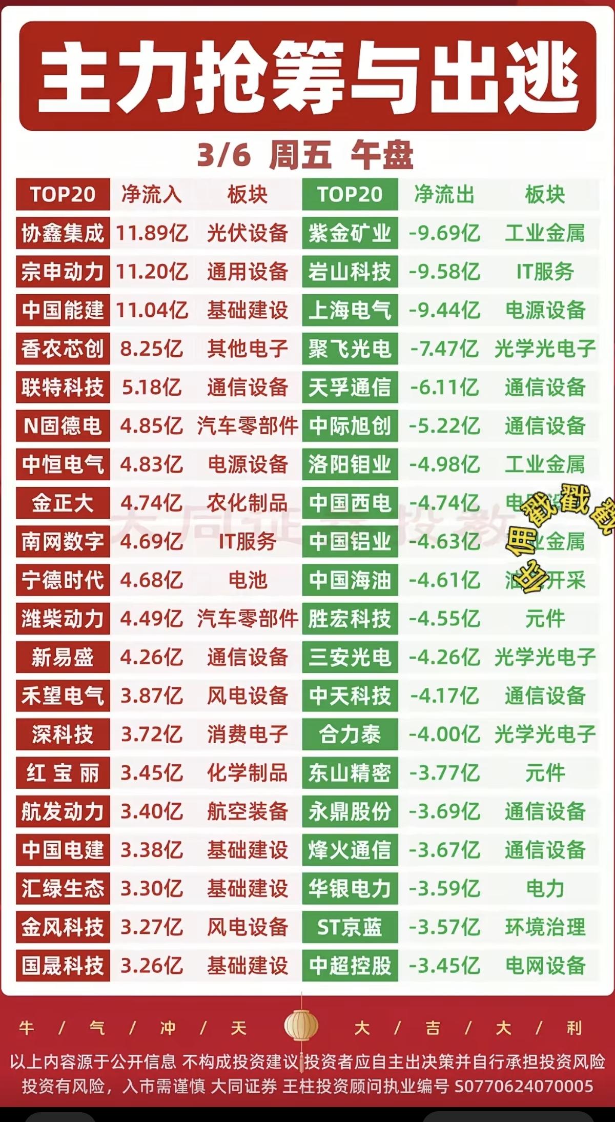 3.6周五 主力大资金 抢筹出逃个股榜! 资金抢筹: 智能电网、装修装饰、房地产服务、旅游酒店、多元金融、生态农业、钛白粉、人脑工程、辅助生殖等。 资金出逃: 油气油服,煤化工、植物照明、中芯国际概念、激光雷达、光通信、光学电子等资金出逃