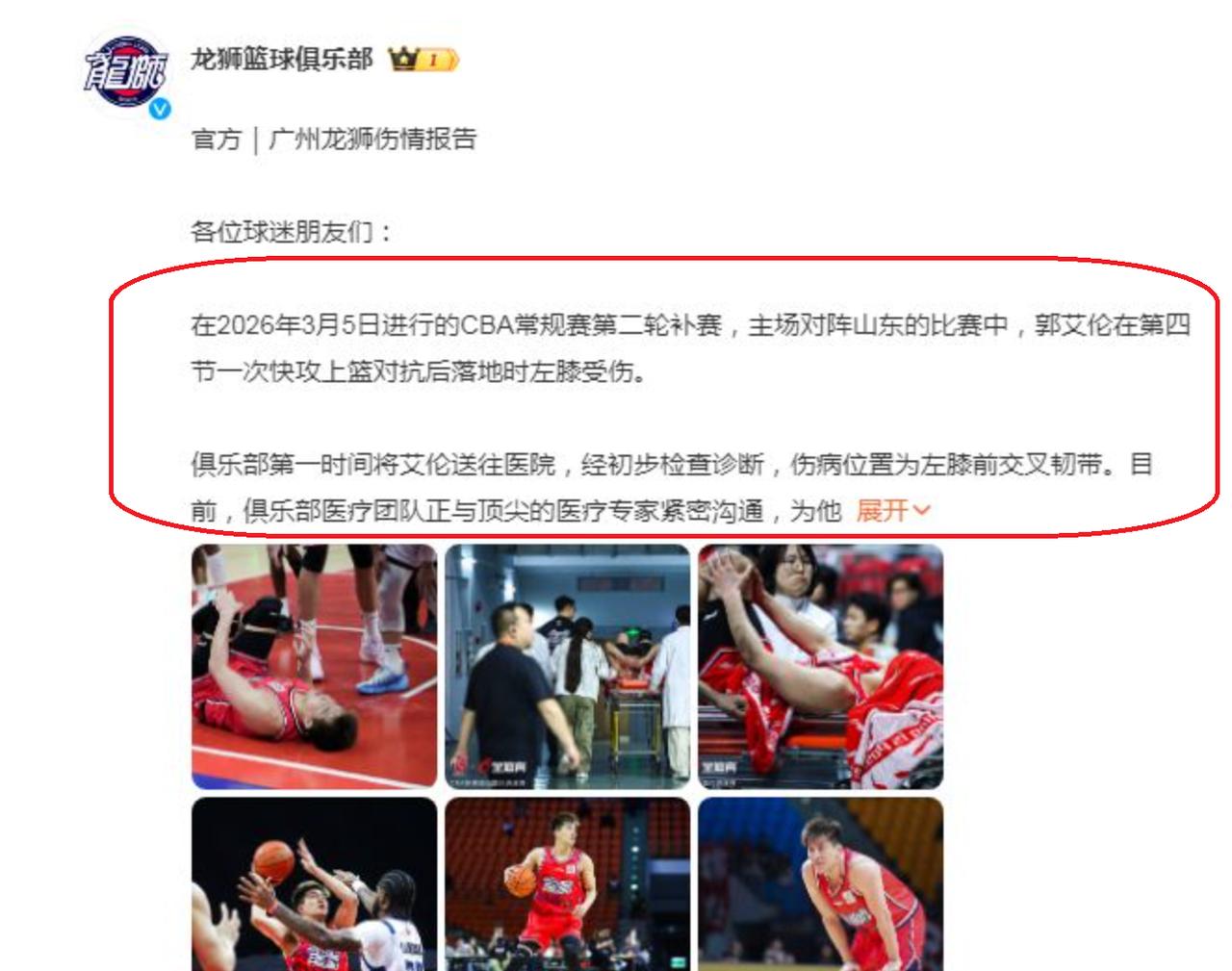 郭艾伦最新伤情出炉!本赛季提前报销,媒体人:可能会提前退役 昨晚,CBA常规赛迎来了一场补赛,广州队坐镇主场PK山东队,双方经过四节PK,最终,广州队更胜一筹,以8分的优势击败了山东队,笑到了最后。拿下这场比赛,广州队以11胜12负的成绩,反超辽宁队,上升到积分榜第11名。可以说,只要广州队保持这个状态,很有可能会拿到CBA季后赛的门票。 不过,广州队虽然是拿下了一场关键的比赛胜利,但是,却遭到了一个重大的打击,球队主力后卫郭艾伦,在比赛中受到了重伤。在第四节比赛,还有6分33秒的时候,郭艾伦想要冲击篮下得分,然而,他准备上篮的时候,与山东队球员谢智杰有一个身体对抗,随后郭艾伦就应声倒地,接下来,大家也是看到了,郭艾伦躺在地上,显得十分痛苦,随后,就被担架抬出,送往医院进行检查和治疗。 后来,广州队也是在第一时间公布了郭艾伦的伤情,广州队公告内容表示:郭艾伦伤病位置为左膝前交叉韧带断了,接下来,球队会请专家制定康复方案,给郭艾伦一个最好的康复治疗。 根据了解,郭艾伦这样的伤病,康复起来,也是一件非常麻烦的事情,康复时间会很长,预计会在8个月至1年左右。如此情况,对于33岁的郭艾伦来讲,毫无疑问,是一个巨大的打击。 有媒体人看到郭艾伦的这个伤病表示:郭艾伦已经33岁了,现在左膝前交叉韧带断了,康复需要一年,这对他来讲,完全就是晴天霹雳,也许,他的职业生涯就此终结,要退役了。 实话实说:郭艾伦在这几个赛季,一直都是处于伤病的阴霾之中,特别是最近三个赛季,他没打几场比赛,不是受伤,就是在受伤的过程当中。再加上,他不断参加各种商业活动,也许,有不少球迷都忘了CBA赛场上,还有一个郭艾伦。 可以说,郭艾伦此番受伤,也有可能与他平时训练有关,因为,不断参加各种活动,导致他的训练量下滑,训练质量下滑,从而让他的身体机能已经不足以参加激烈的比赛,如此一来就增加了受伤的风险。 毫无疑问,接下来,郭艾伦应该要重新规划自己的人生了!