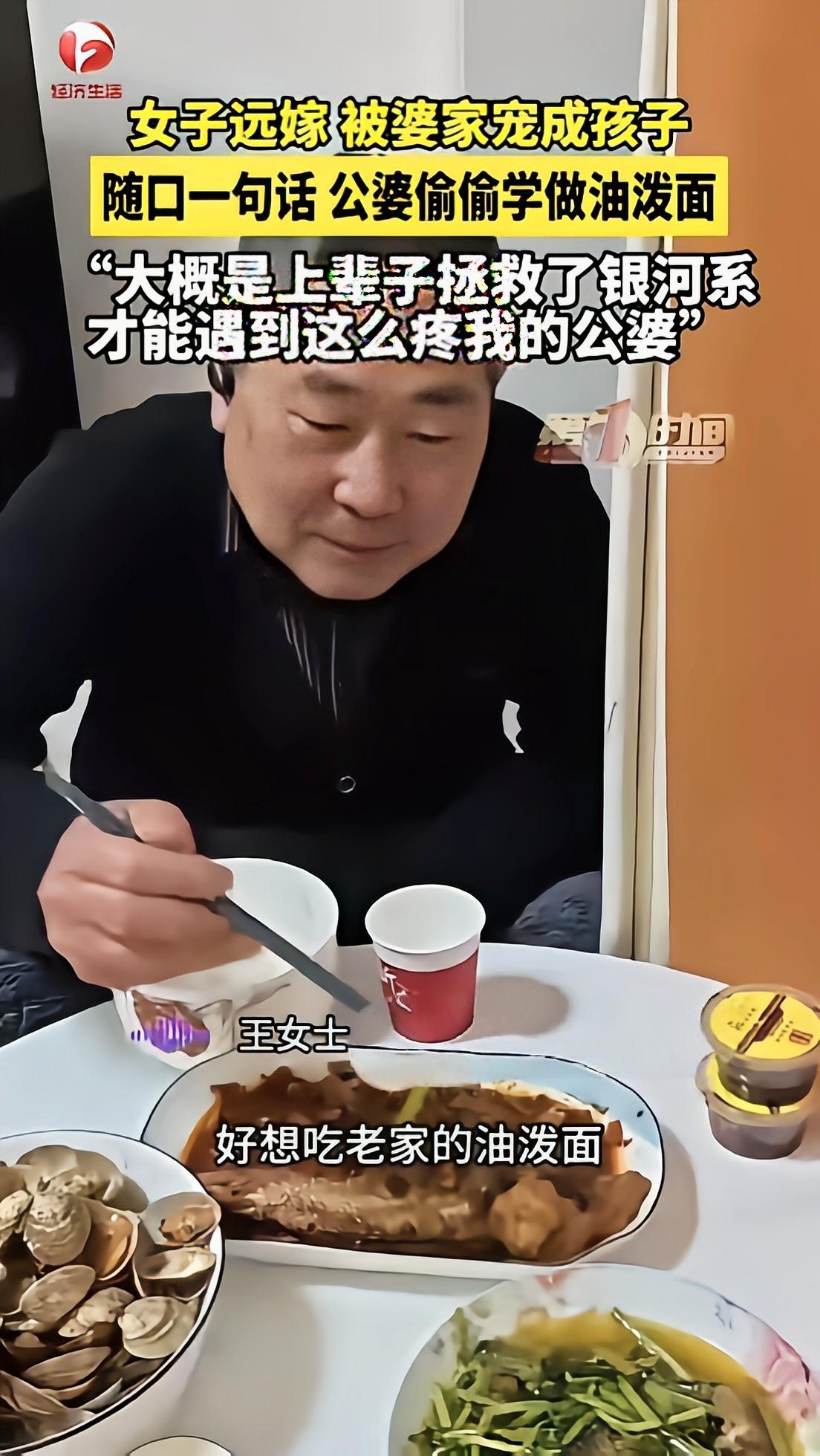 南昌一女子随口说想吃油泼面,公公婆婆偷学成功后第二天就把油泼面端上桌,远嫁的她哭了:上辈子拯救了银河系。 南昌的王女士,最近在网上发了一段视频,说自己随口一句话,公婆居然偷偷去学了,给她做了一碗油泼面。 事情是这样的,王女士其实是远嫁到南昌的,平时公婆对她就不赖。她说公公经常天不亮就起来,把早餐买好塞她包里,让她带单位去吃。每天下班回家,桌上饭菜都是热乎的,从来没让她进厨房动过手。 前阵子,王女士也不知道怎么就想起老家的油泼面了,在家随口秃噜了一句:“哎呀,好想吃一碗老家的油泼面啊。”说完她自己转头就忘了,该干嘛干嘛。结果她公婆把这话听心里去了,老两口也没声张,偷偷摸摸在厨房里研究咋做。 等第二天端上桌让她尝的时候,王女士整个人都愣住了。她当时心里那叫一个感动,觉得自己哪是嫁出去的媳妇,简直是被老两口当亲闺女,不对,当小孩给宠着了。 有人说:“这就是嫁对人的样子吧,公婆把你当亲闺女疼,日子能过得不顺心吗?” 也有人酸了:“同样是远嫁,我随口说想吃啥,婆婆回我一句‘咱家没人会做那个’,然后就没然后了。” 还有网友说:“将心比心,王女士平时肯定对公婆也好,不然人家凭啥这么上心?善良的人遇到善良的人,这才是一家人。” 其实公媳关系、婆媳关系这事,说到底就是将心比心。你对我好,我心里记着,有机会我也对你好。人心都是肉长的,谁愿意热脸贴冷屁股?王女士公婆这么做,王女士肯定也差不了,这一家子才能越过越好。 当然了,也有人会说“这不就是一碗面吗,至于感动成这样?”至于。因为让人暖心的从来不是那碗面,是“我说的话你放在心上”这个态度。