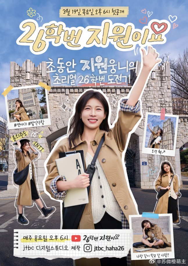 河智苑欧尼!!!!!!!!河智苑成为26学号新生!!!将于19日首次公开的JTBC数字工作室新网络综艺《26级智苑》,讲述了从檀国大学戏剧电影系毕业的河智苑,以26学号新生的身份重新进入大学后展开的横冲直撞的校园生活。包揽百想艺术大赏、青龙电影奖乃至电视台演技大赏的国民演员河智苑,此次变身为大学新生,将展现怎样的新面貌备受期待。河智苑最近亲自参加了一所大学的入学典礼,宣告了《26级智苑哟》的开始。据悉她以令人惊讶的童颜外貌,自然地混入新生中进行了拍摄。以“尽力而为”为座右铭的河智苑选择了哪所学校和专业,又将如何像真正的大学生一样,从选课、听课、实践、社团活动到联谊,投入到“真实”的校园生活中,创造出怎样的故事,引发了人们的好奇。制作团队表示:将能见到河智苑洒脱而又凡事尽力的魅力”,超越世代与26学号的Z世代(GEN-Z)共同创造的愉快化学反应,以及在繁忙日程中展现的她独有的健康美容秘诀,将是另一大看点。演员河智苑的26学号新生挑战记,JTBC数字工作室《26级智苑哟》预计将于19日开始每周四晚6点在同名YouTube频道公开。