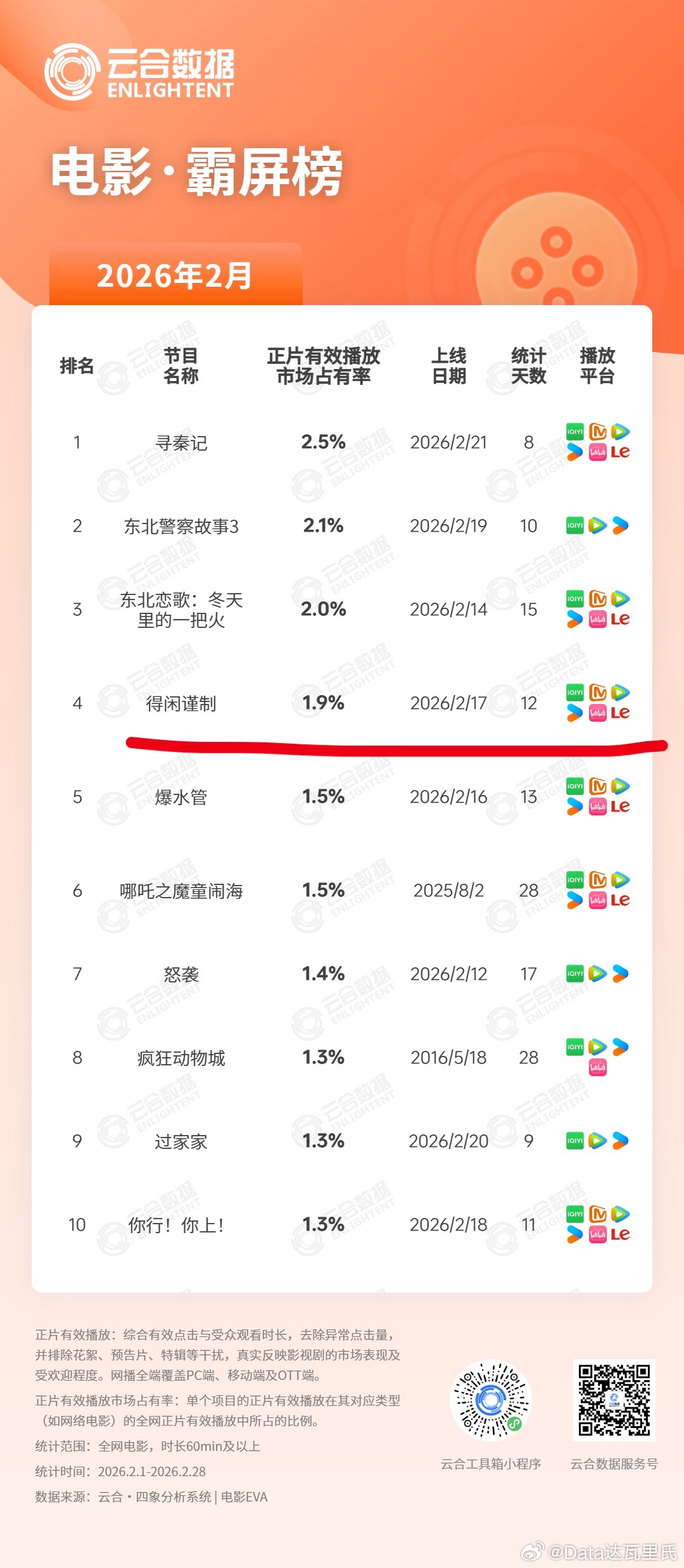 《得闲谨制》上线了鹅桃酷芒B乐几个流媒体平台,二月电影正片占比1.9%,排第4