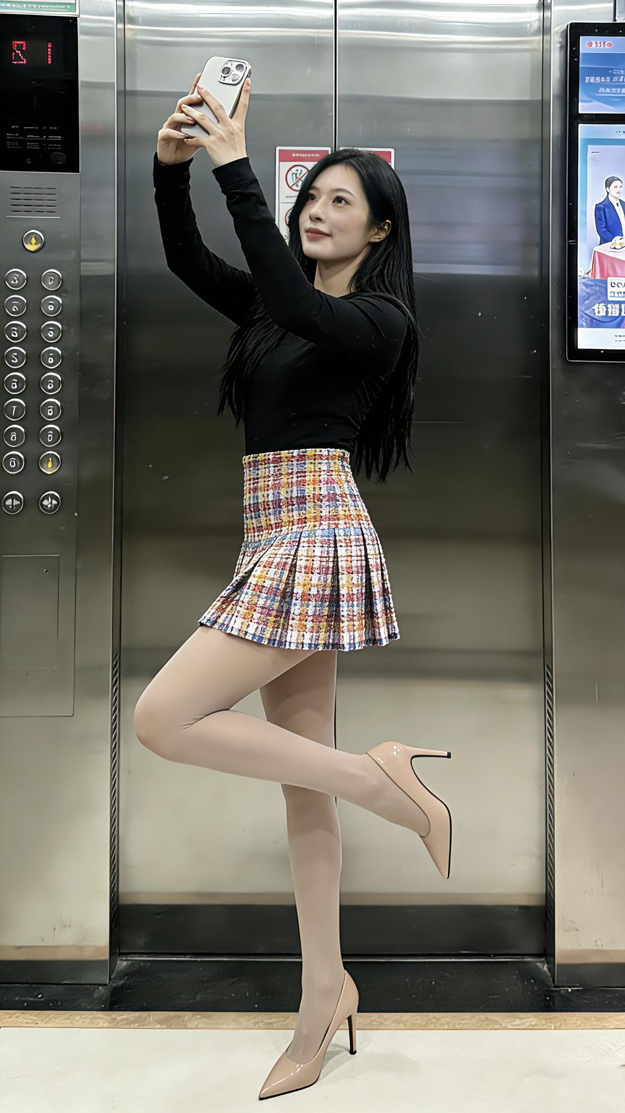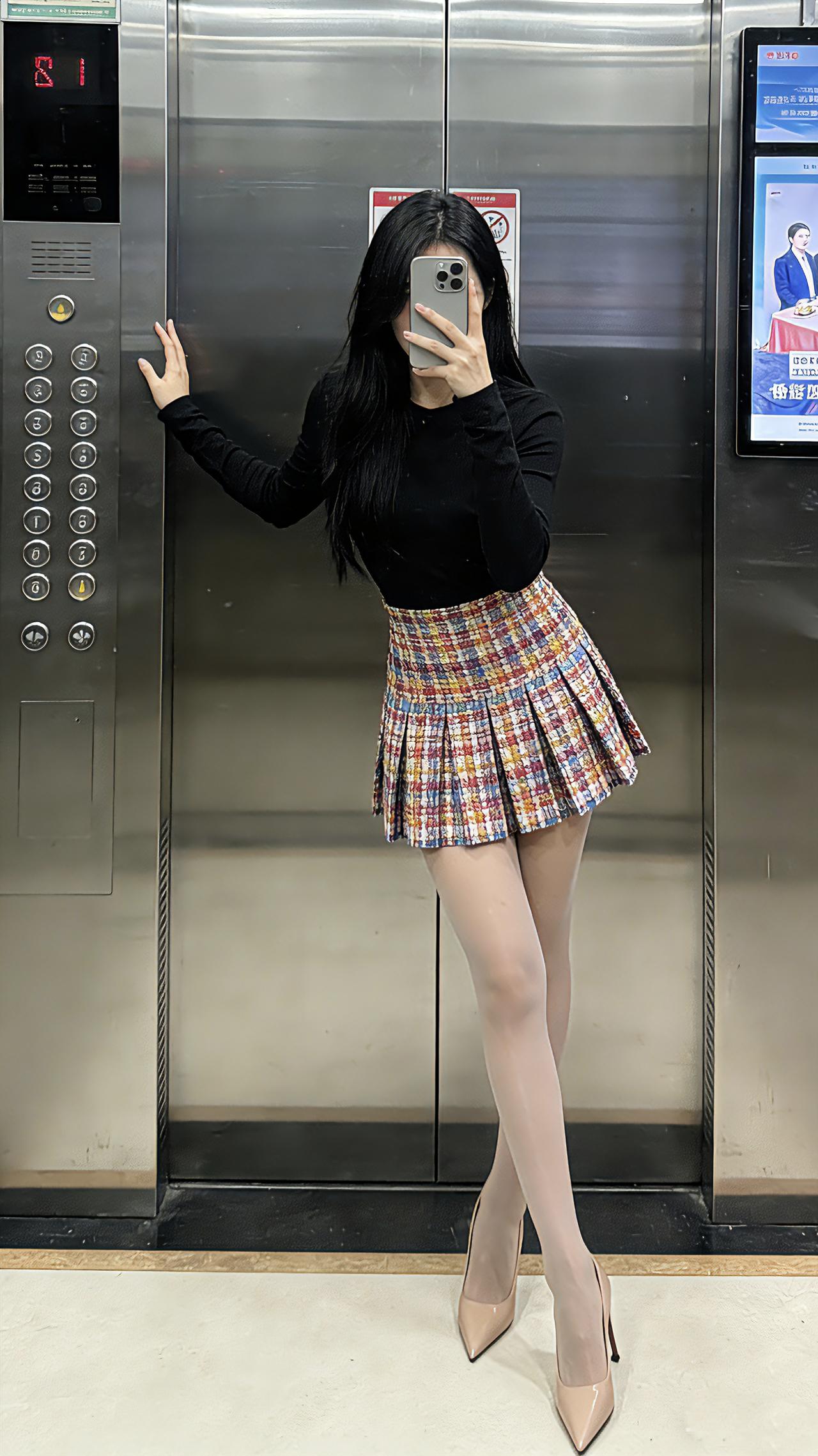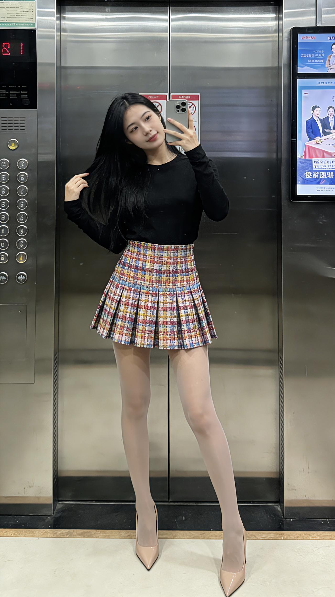 这种轻熟甜酷风你们爱了吗?电梯间里,黑上衣衬得清爽利落,彩格褶裙一摆又裹满复古甜意~裸高跟鞋踩出纤细脚踝,轻熟里藏着不费力的酷!甜酷穿搭 轻熟风 短裙穿搭 电梯拍照