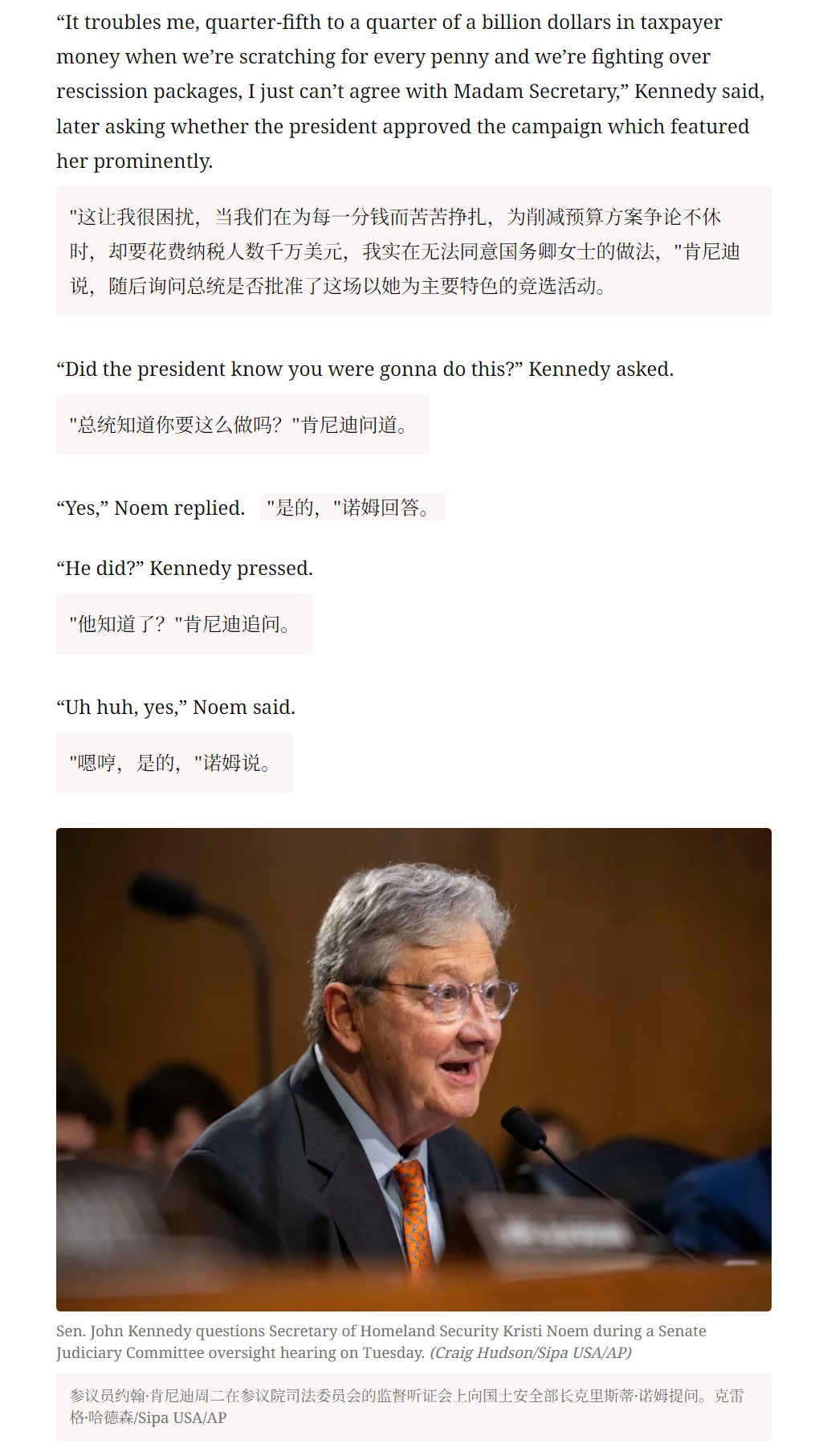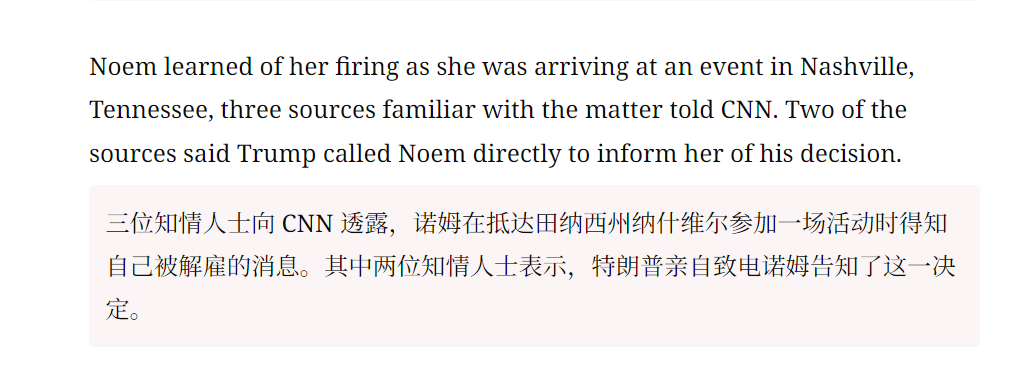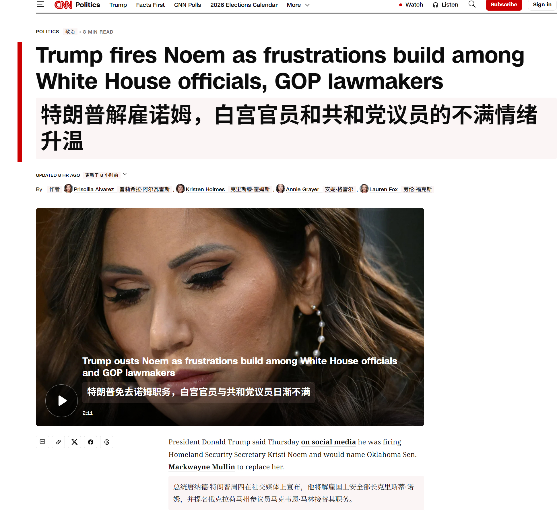 🔻CNN:特朗普解雇诺姆,白宫官员和共和党议员的不满情绪升温。🔻特朗普周四在社交媒体上宣布,他将解雇国土安全部长克里斯蒂·诺姆,并提名俄克拉荷马州参议员马克韦恩·马林接替其职务。🔻助手们表示,特朗普喜欢在电视上观看马林的表现,这在他决定提名马林担任该职位时起到了一定作用。特朗普曾在激烈的采访后致电穆林以表扬他,白宫工作人员也经常派遣这位参议员在政府重要时刻接受有线电视新闻采访。🔻三位知情人士向 CNN 透露,诺姆在抵达田纳西州纳什维尔参加一场活动时得知自己被解雇的消息。其中两位知情人士表示,特朗普亲自致电诺姆告知了这一决定。🔻特朗普上任初期任命诺姆执掌国土安全部,但她在任内的行为日益受到审查,包括被指与首席顾问存在恋情、分配部门获得的意外之财(尤其用于突出展示她个人形象的高价广告宣传),在涉及ICE特工杀人事件上前后矛盾的陈述,在当前国土安全部资金短缺期间,她决定暂停运输安全管理局的预先检查计划,这一决定令白宫措手不及,且在几小时内被撤销,以及她本周在两次国会听证会上的回应。🔻特朗普本人对听证会的进展感到愤怒——尤其是她声称总统知晓她的国土安全部广告活动,而特朗普对此予以否认。🔻这些广告常常突出展示诺姆本人。据 ProPublica 去年报道,一份利润丰厚的广告转包合同的接收方是前国土安全部发言人的丈夫。尽管诺姆辩称广告招标程序合规,但参议员表示他的调查"显示你并未进行公开招标",并举例指出,诺姆选择的某家公司"在你选定他们前 11 天才刚刚成立"。🔻"这让我很困扰,当我们在为每一分钱而苦苦挣扎,为削减预算方案争论不休时,却要花费纳税人数千万美元,我实在无法同意国务卿女士的做法,"肯尼迪说,随后询问总统是否批准了这场以她为主要特色的竞选活动。🔻"总统知道你要这么做吗?"肯尼迪问道。🔻“Yes,"诺姆回答。🔻"他知道了?"肯尼迪追问。🔻"嗯哼,是的,"诺姆说。🔻特朗普在周四接受路透社采访时否认知晓该活动。他说:"我对此一无所知。"美国国土安全部部长被解职海外新鲜事热点现场