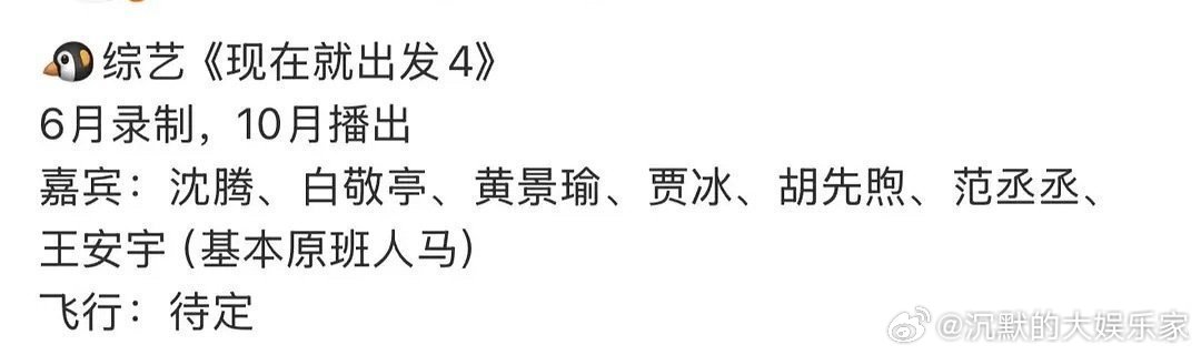 节目6月初开始录制,10月中旬播出。沈腾、王安宇、范丞丞、贾冰、胡先煦、白敬亭、黄景瑜,网传常驻女嘉宾金晨被换了,换成了姜妍,她之前以飞行嘉宾的身份参加了《现在就出发3》,贡献了不少笑点,而且有一手好厨艺。不管怎么样这个阵容还是很让人期待的,静等官宣。曝现在就出发4金晨被替换了