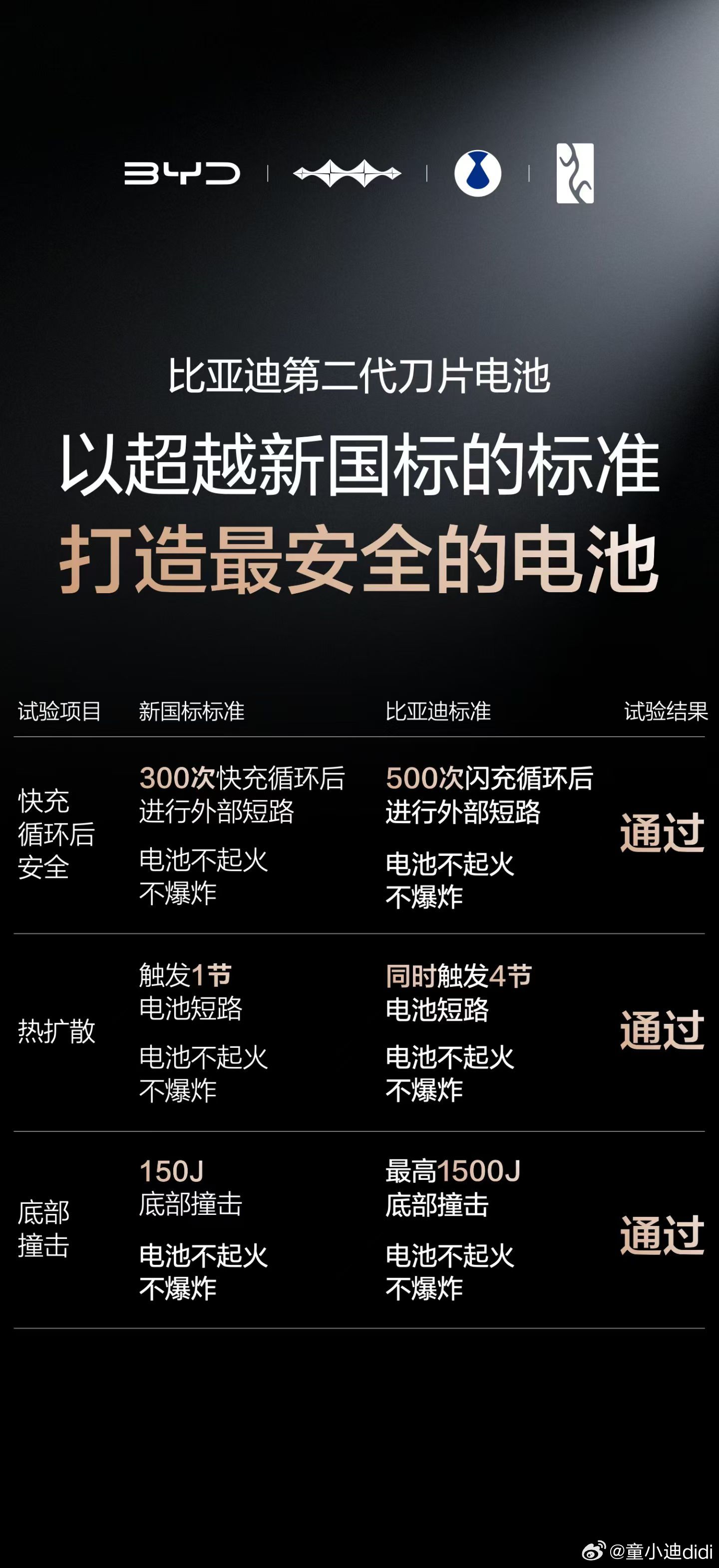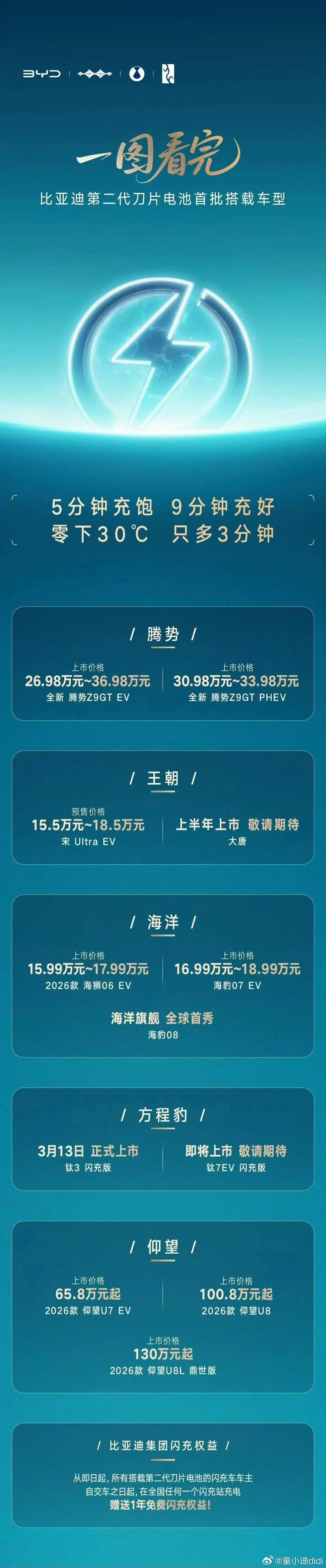 3月5日比亚迪在深圳发布第二代刀片电池及闪充技术,攻克充电慢、低温充电难行业难题,电动化上半场完美收官。实现常温10%至70%仅需5分钟、10%至97%仅9分钟,-30℃低温下20%至97%也仅12分钟。第二代刀片电池能量密度较上一代提升5%,腾势Z9GT搭载后续航达1036公里,电池质保容量保持率提升2.5%且电芯终身保修,安全标准超新国标。配套闪充桩单枪功率1500kW为全球量产最高,还推出滑轨悬吊式T型桩等人性化设计。比亚迪同步启动“闪充中国”战略,年底将建20000座闪充站,还为相关车主提供1年免费闪充权益。硬核闪充技术树立行业新标杆。比亚迪今晚发布二代刀片及闪充 比亚迪第二代刀片电池大v聊车