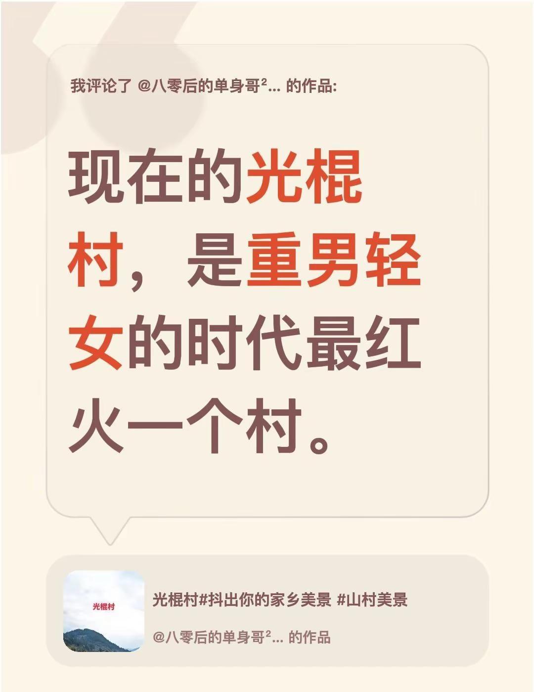 我评论了@八零后的单身哥²⁰²⁶ 的作品:现在的光棍村,是重男轻女的时代最红火一个村。